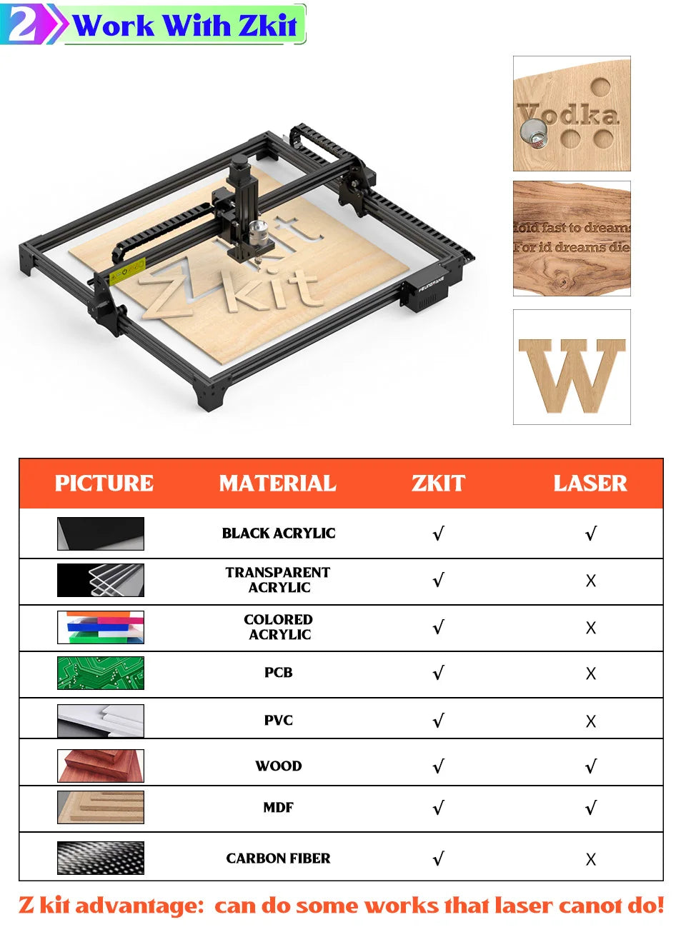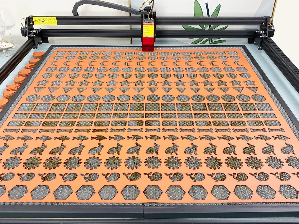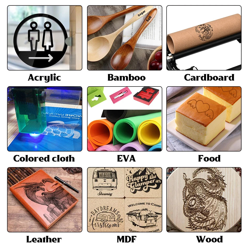 This is depend on different laser power,normally can work on: Wood/MDF/acrylilc/PVC/PCB/bamboo/plastic/stone/fabric/EVAfoam/carton/ceramics/oxidia aluminum/glass/stainless steel, different power laser can do different job, pls read the parameter test sheet in the description.