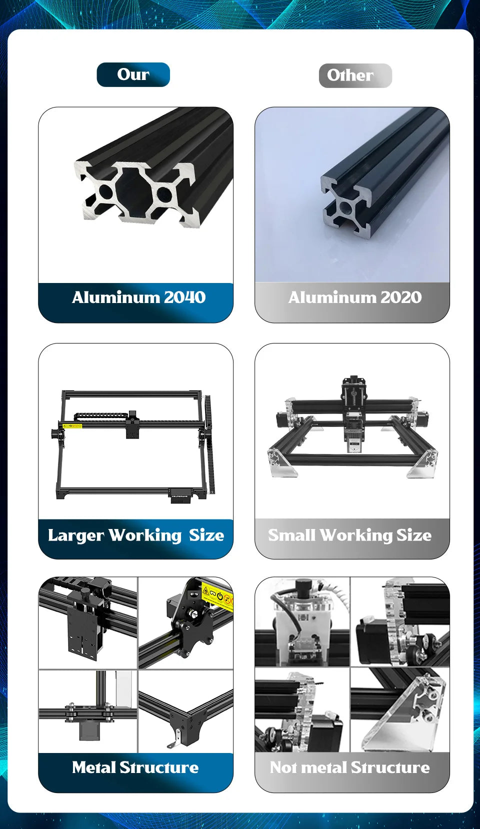 Yes, we use V-slot accurate aluminum rail and V-type plastic wheels, every axis moving accurate and smoothly, the axis gap can be adjustable and it can keep machine more stable and accurate move.