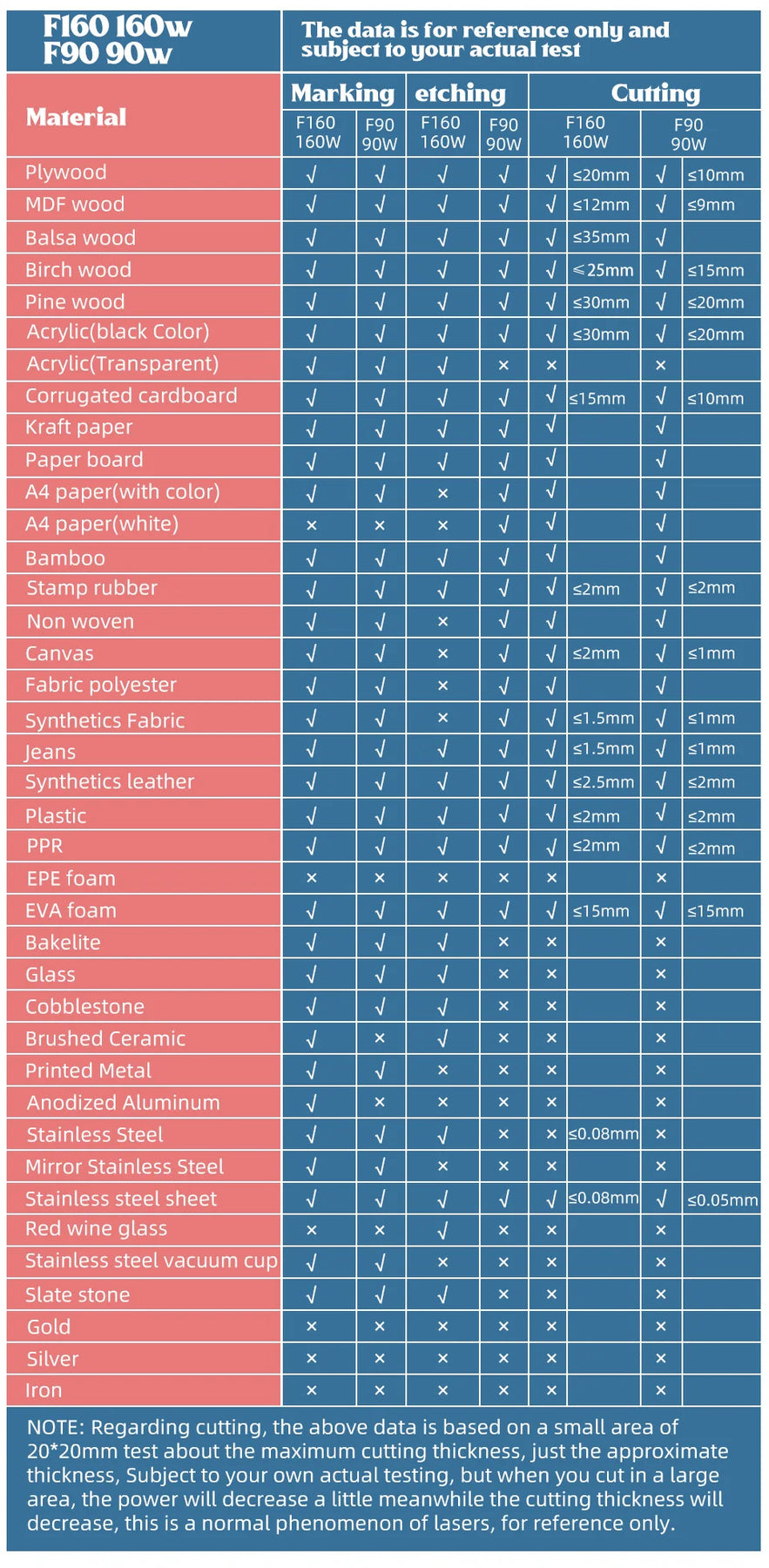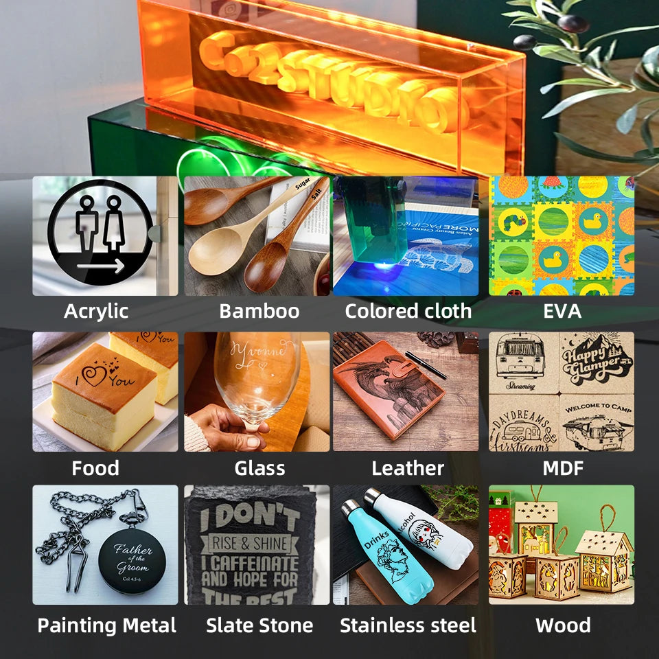This is depend on different laser power,normally can work on: Wood/MDF/acrylilc/PVC/PCB/bamboo/plastic/stone/fabric/EVAfoam/carton/ceramics/oxidia aluminum/glass/stainless steel, different power laser can do different job, pls read the parameter test sheet in the description.