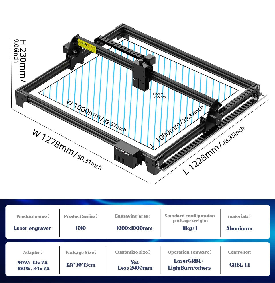 Our machine model name is the working area, for example 1010 mean working area is 1000*1000mm, but machine out size will be larger than 1000mm, you can read on description.