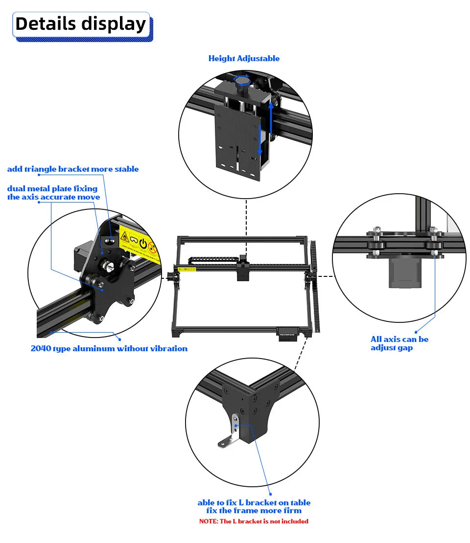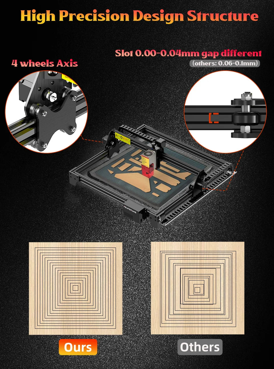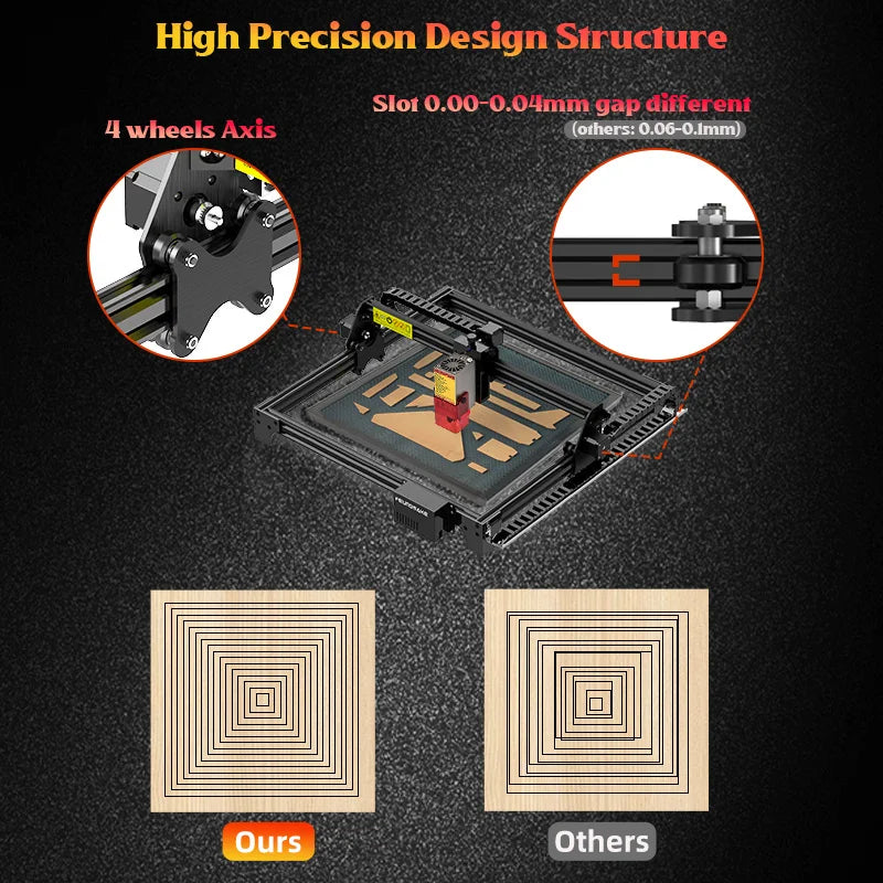 Yes, we use V-slot accurate aluminum rail and V-type plastic wheels, every axis moving accurate and smoothly, the axis gap can be adjustable and it can keep machine more stable and accurate move.