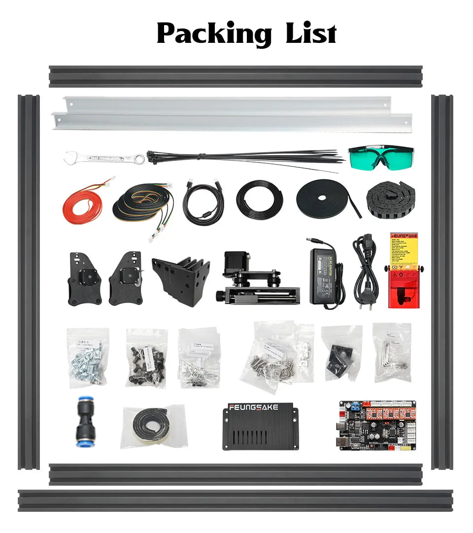 This is completed machine, will come with frame/cables/cable chains/chain support/board/laser/USB/software/instructions, some options with z kit and rotatory please refer option picture it willl display the configurations.