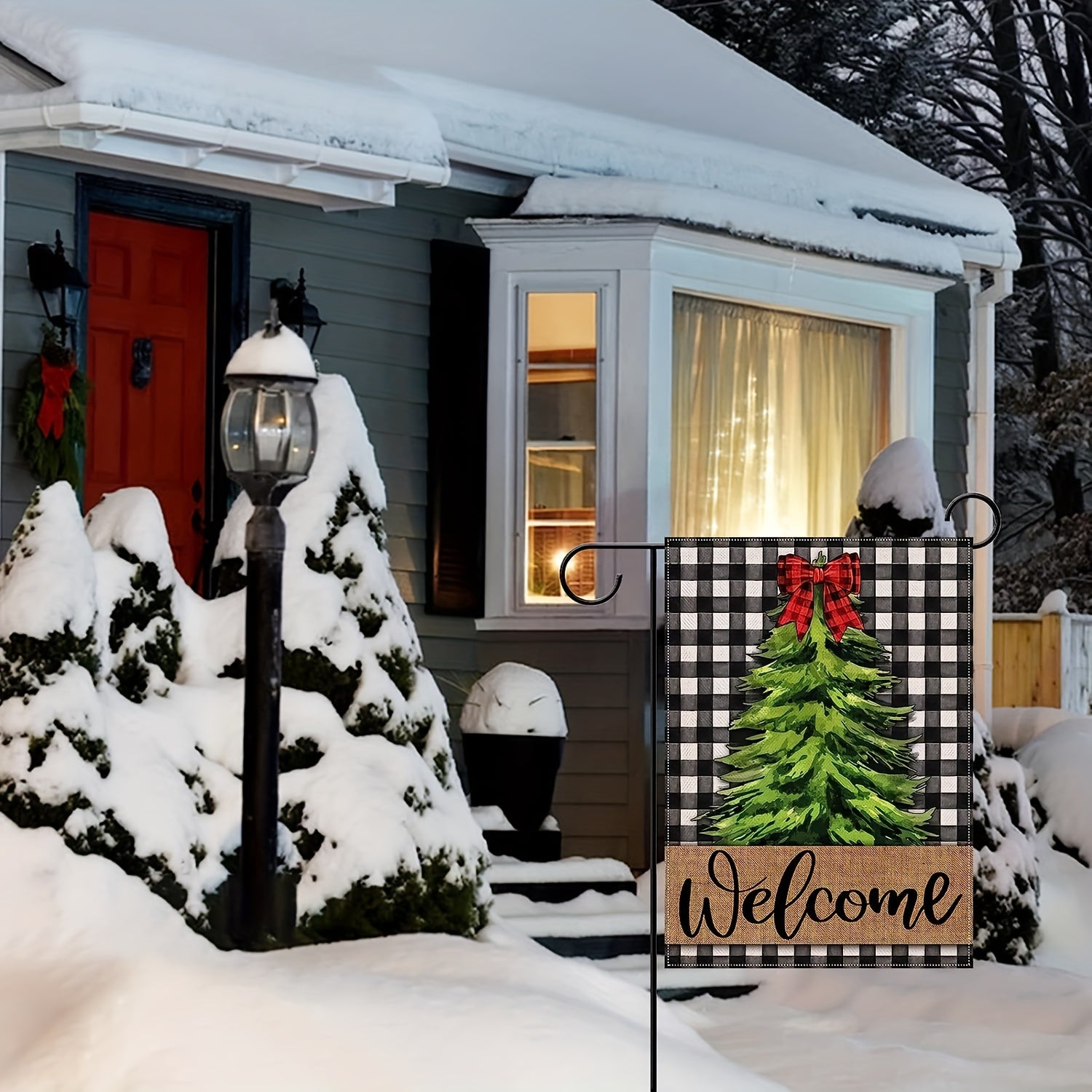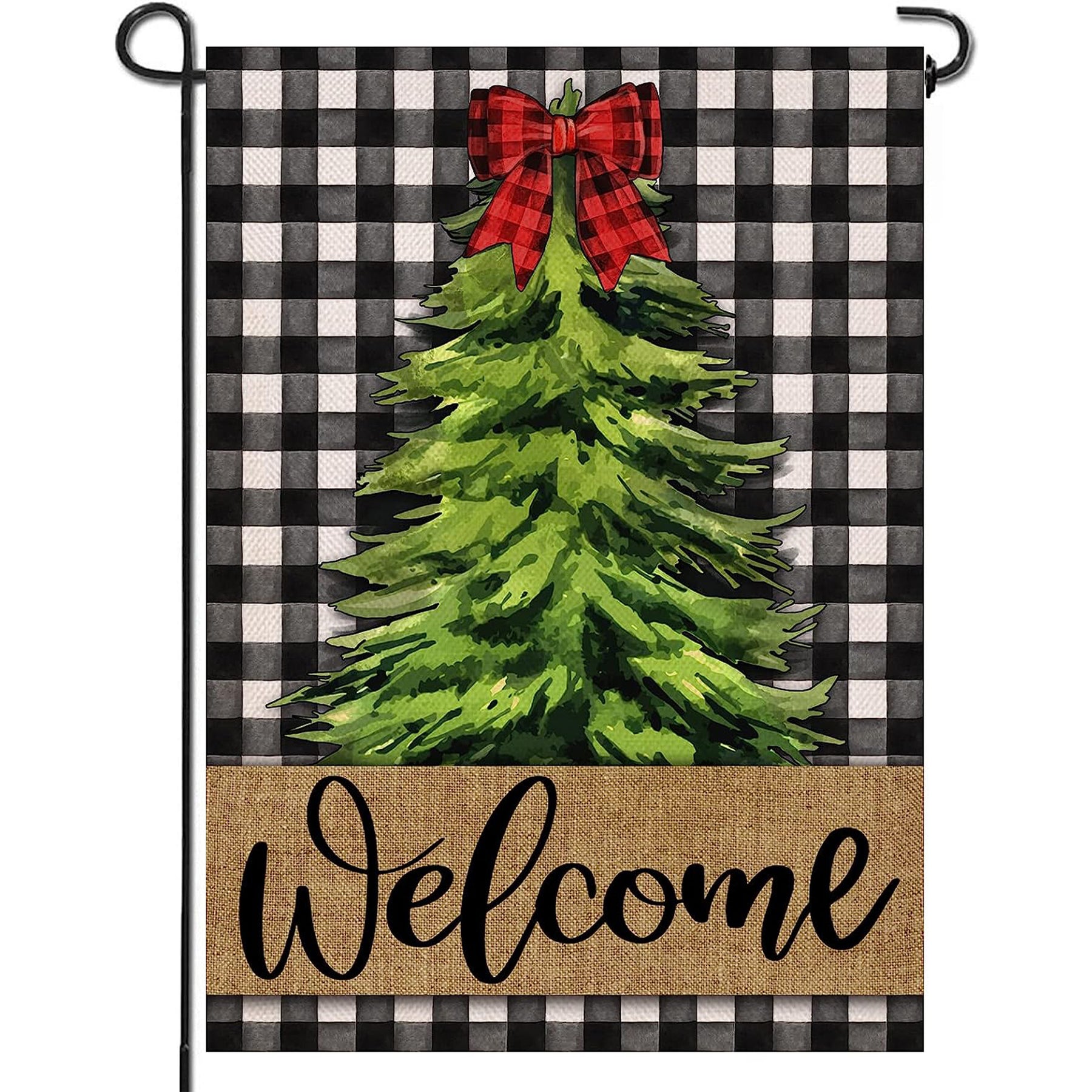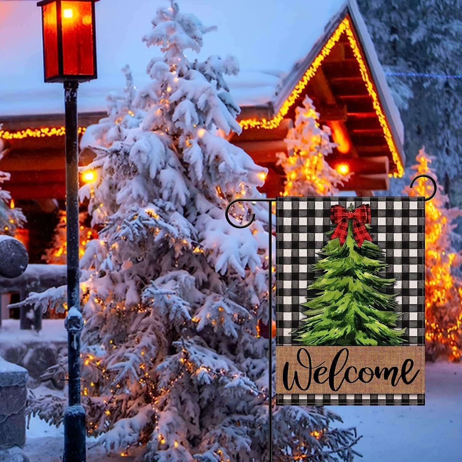 1pc, Welcome Christmas Pine Tree Home Decorative Garden Flag, Xmas Yard Lawn Buffalo Plaid Check Outside Decor, Winter Farmhouse Outdoor Small Burlap Decoration Double Sided 12 X 18 Inch/28 X 40 Inch