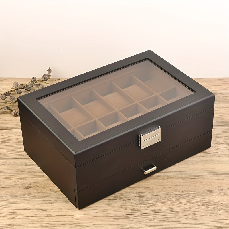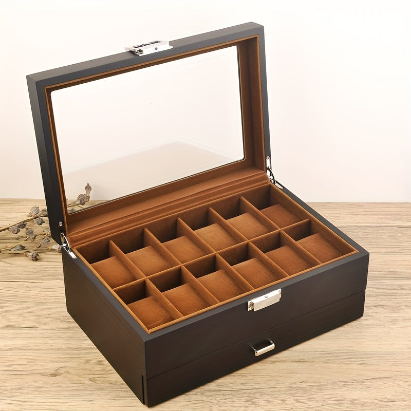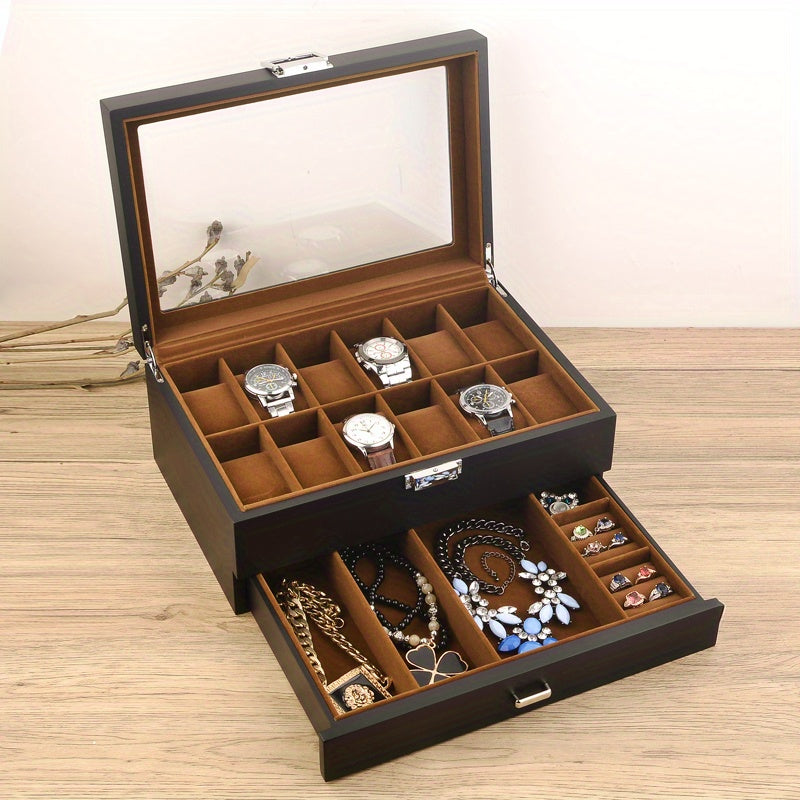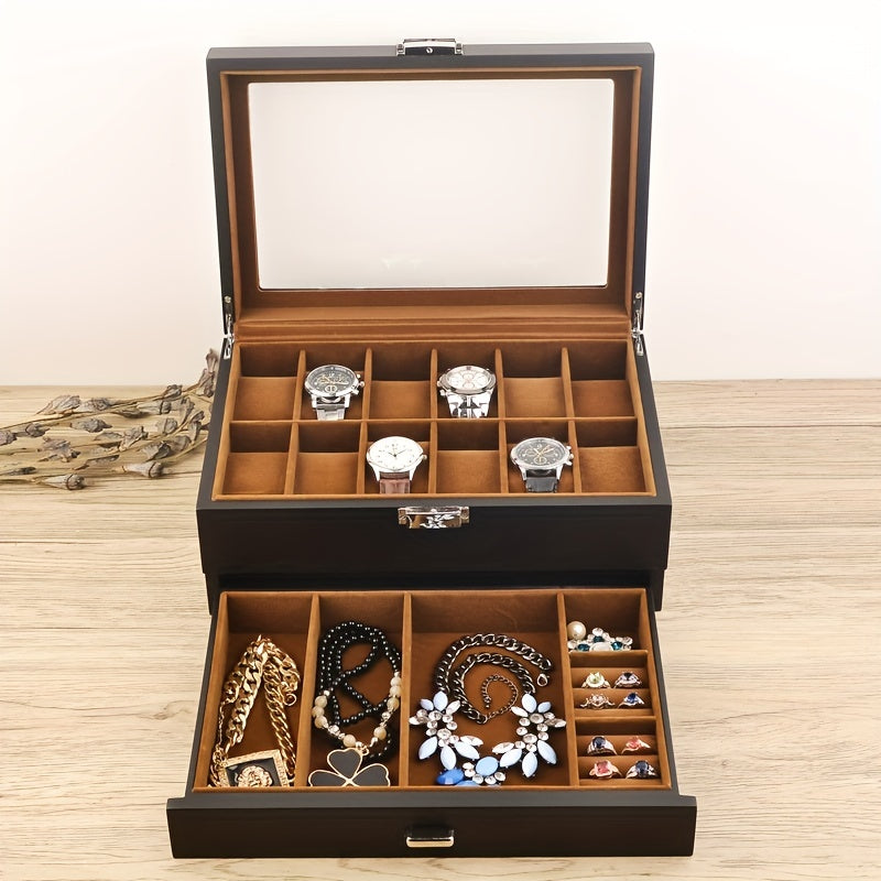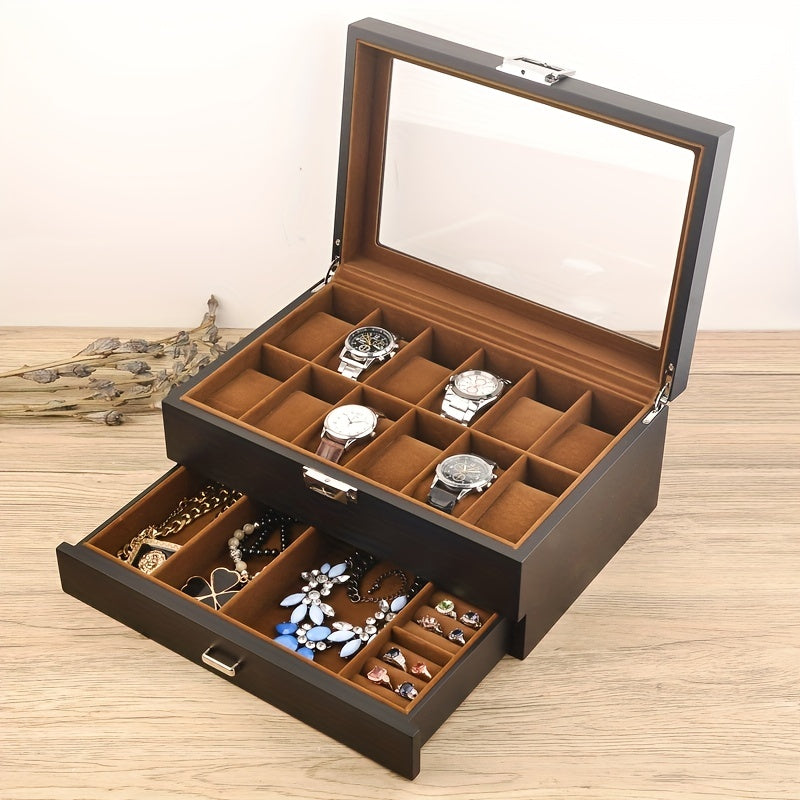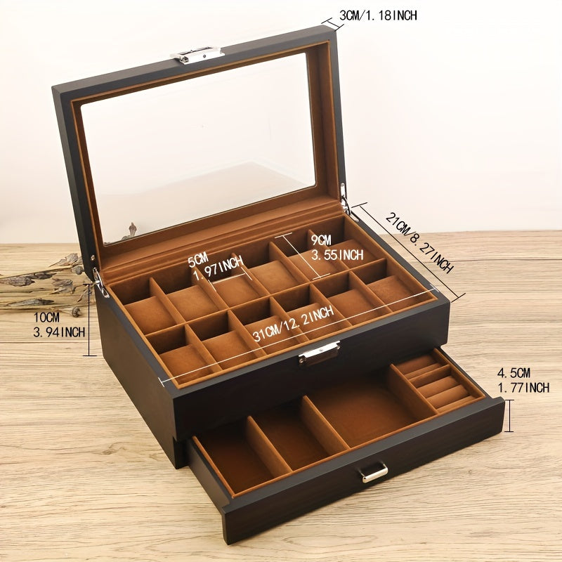 1pc Wooden 2-layer Watch Jewelry Box, Multi-grid Watch Storage Box, Countertop Watch Jewelry Storage Box With Velvet Lining, Light Luxury Watch Jewelry Display Box, With Transparent Glass Top And Accessory Storage Drawer