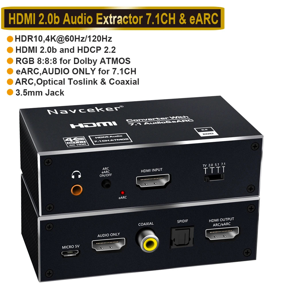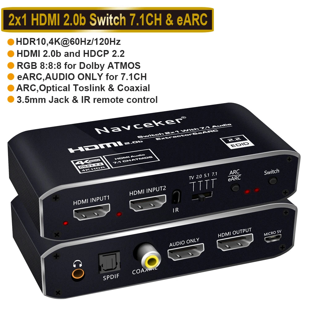 ZY-AV2E,Navceker 2x1 4K 120Hz HDMI 2.0 Switch eARC Audio Extractor is a high performance 2 HDMI input and 1 HDMI output switch with audio out .HDMI /Toslink/3.5mmjack audio output support audio extract function , AUDIO ONLY HDMI /Toslink /Coaxial support ARC (Audio Return Channel),AUDIO ONLY HDMI support eARC (Enhanced Audio Return Channel).The system supports all 3D TV formats in addition to all HDTV formats up to 4Kx2K@60/120Hz RGB 8 :8 :8 .