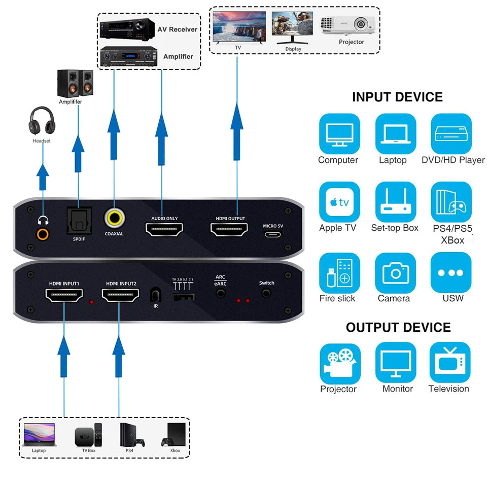 HDMI Input compatible with any HDMI device :such as PS 4/Roku/Fire TV /Blu -ray players /Apple TV /Xbox/Nintendo Switch /PS4Pro /Xbox 3 60/Xbox One X / PS 3/Beamer/Laptop and other HDMI signal source .HDMI video /audio Output :Monitor ,TV ,Projector .HDMI audio /SPDIF/Coaxial/3.5mm audio output :Receiver ,Amplifier ,Speaker ,headphone and other audio device .
