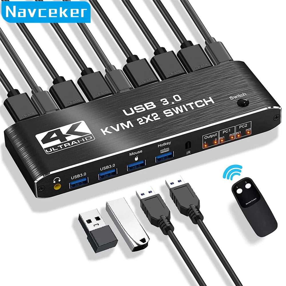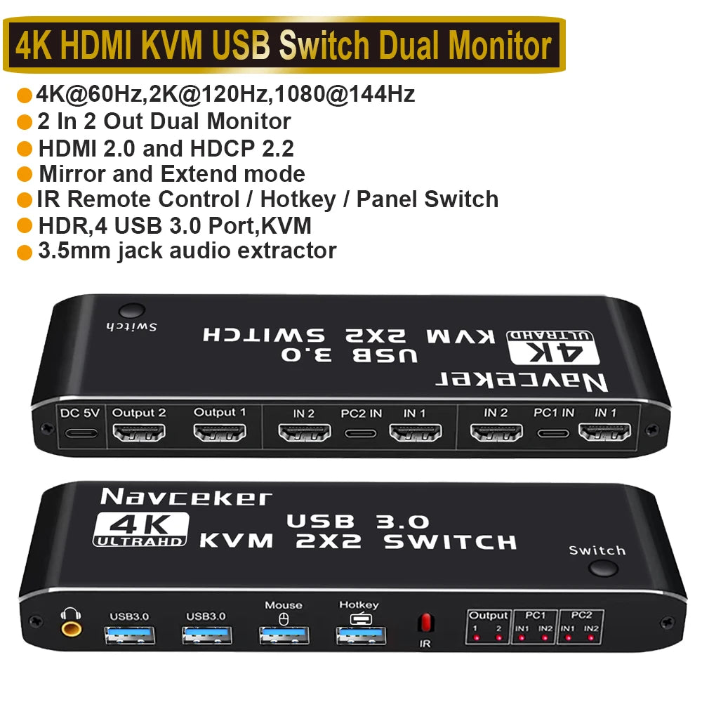 ZY-AK3,Navceker 4K HDMI USB KVM Switch allows you to share one USB keyboard, USB mouse, and two HDMI monitor to control 2 computers, laptops, game consoles.