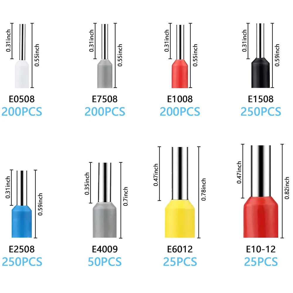 1. Includes packaging: 1 wire crimper+1200 crimping connectors (including 8 sizes: E1508-250PCS E2508-250PCS E0508-200PCS E7508-200PCS E1008-200PCS E4009-50PCS E6012-25PCS E10-12-25PCS). Multiple connectors for you to choose from.