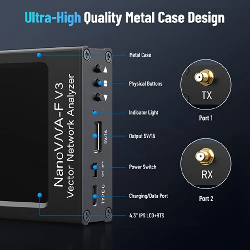 El Analizador de antena NanoVNA-F V3 es adecuado para pruebas de antena en bandas de frecuencia MF/HF/VHF/UHF/SHF. Admite múltiples formatos de visualización: Log, lineal, fase, Smith R + jX, Smith R + L/C, VSWR, polaridad, retardo de grupo, resistencia, reacción, etc. También se puede utilizar para medir filtros, amplificadores, atenuadores, cables, distribuidores, acopladores, duplexores y otros componentes RF. Para el operador de radio aficionado o entusiasta de la radio, este último Analizador de antena VNA W