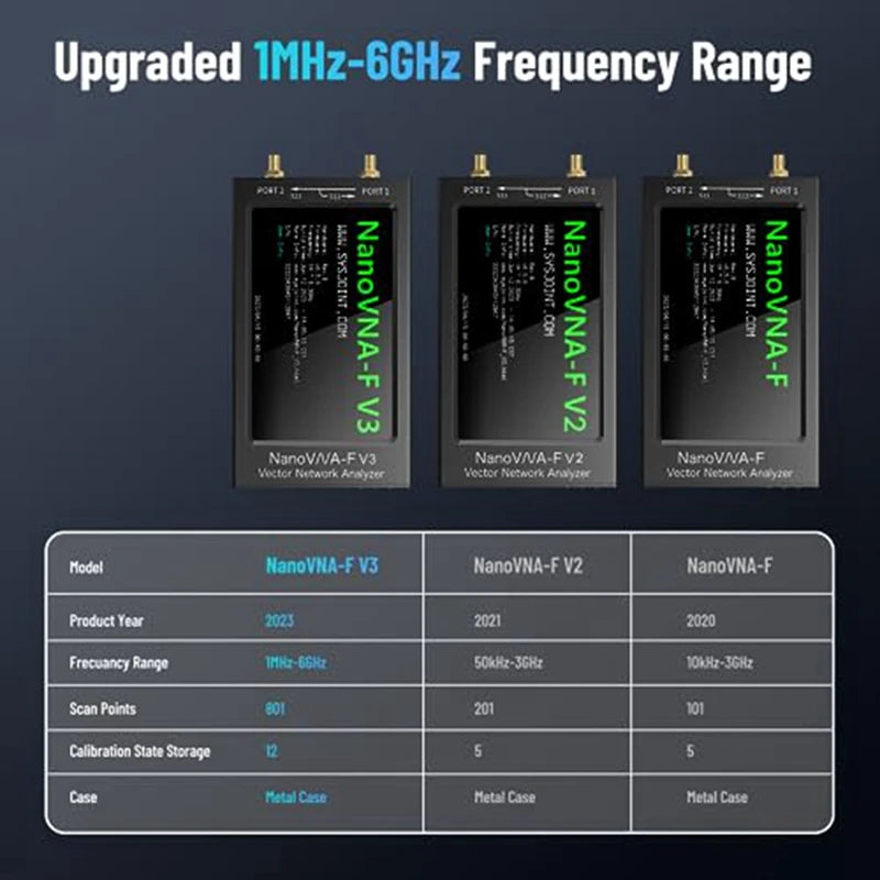 En Comparación con NanoVNA-F V2 (50kHz-3GHz), la versión mejorada de Nanovna-F V3 tiene un rango de frecuencia de medición ultra ancho de 1MHz-6GHz. El rango dinámico S21 de NanoVNA-F V3 es 65 dB, mientras que el rango dinámico S11 es 50 dB. . Los puntos de escaneo son tan altos como 101-801, y los resultados de calibración se almacenan como 12, cubriendo todo el rango de frecuencia baja o alta. Con un rendimiento de medición más rápido y preciso, puede manejar fácilmente pruebas de medición en varios campos.