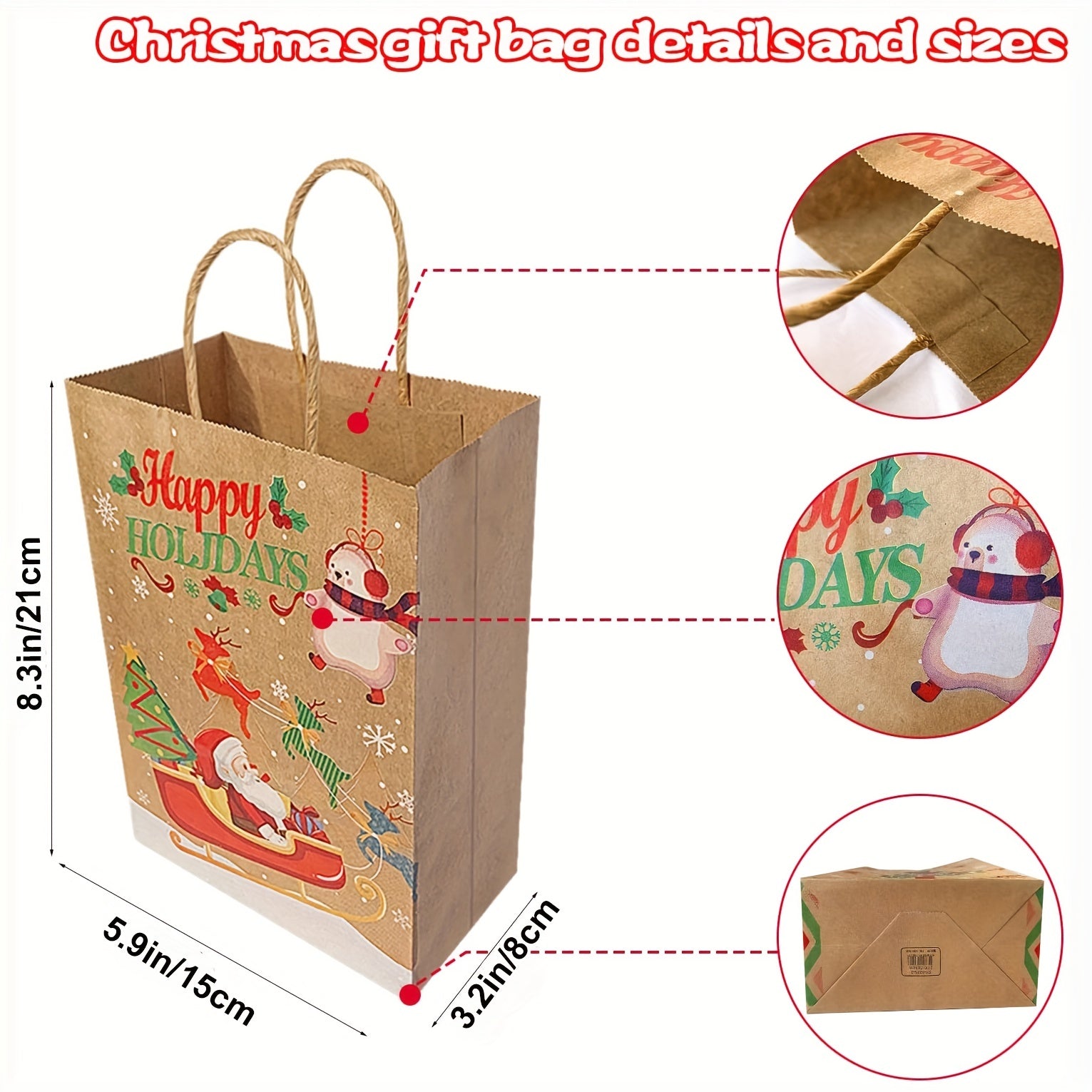 These holiday gift bags are made of high quality kraft paper bag, which is durable, unbreakable and sturdy, and can be reused. Kraft paper bags look textured and are more advanced and environmentally friendly than plastic bags.