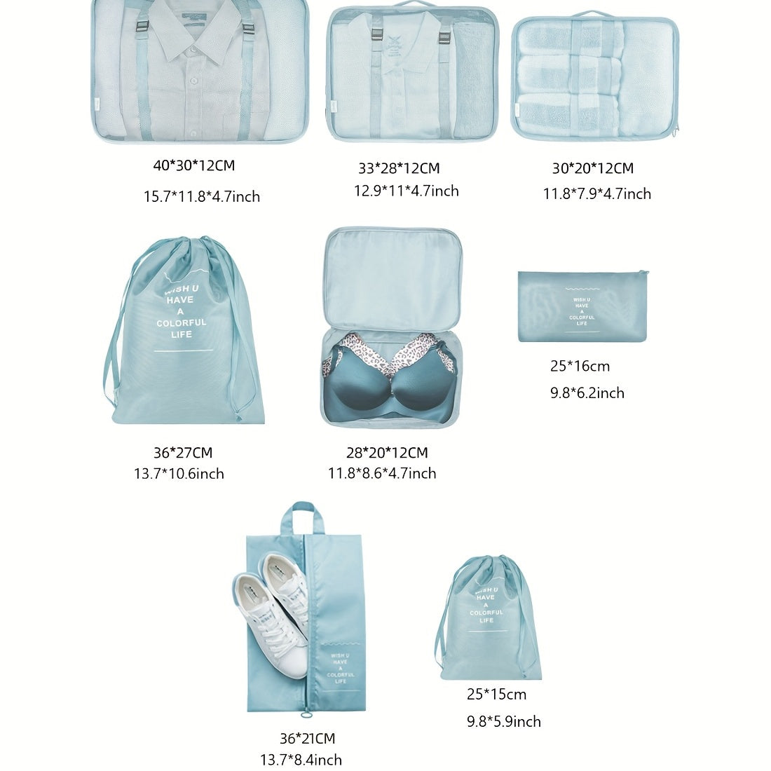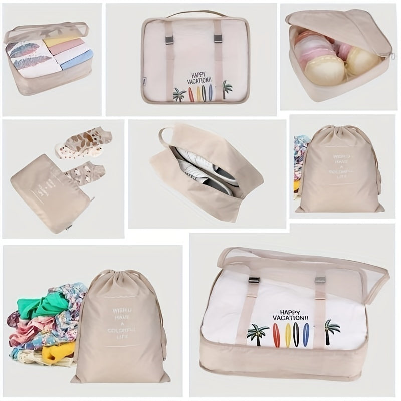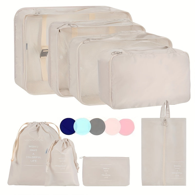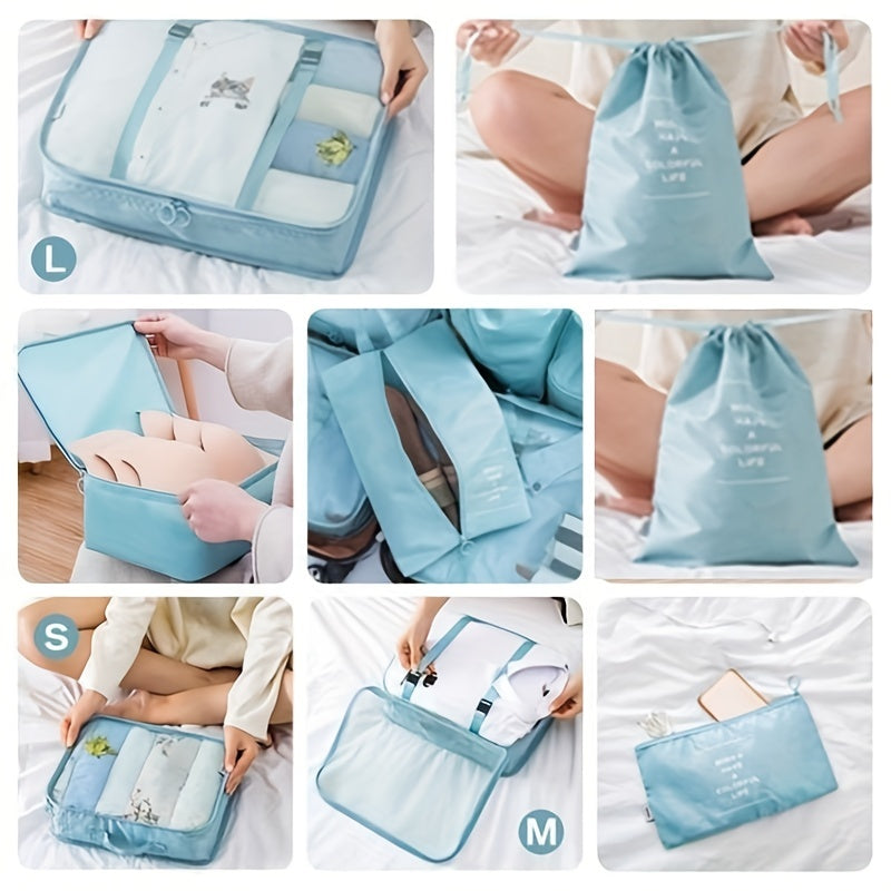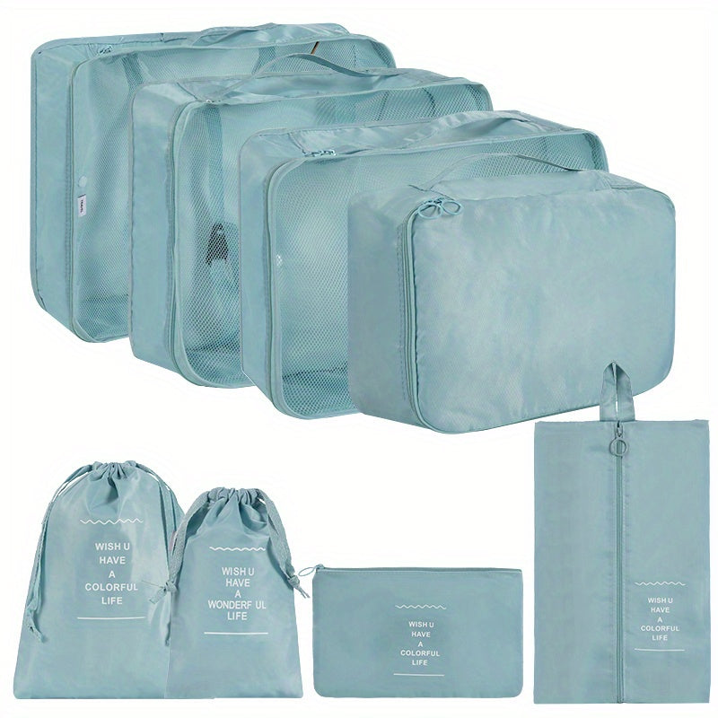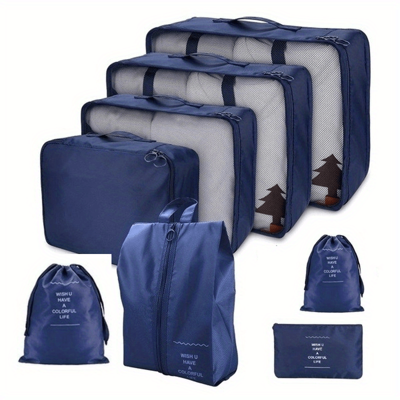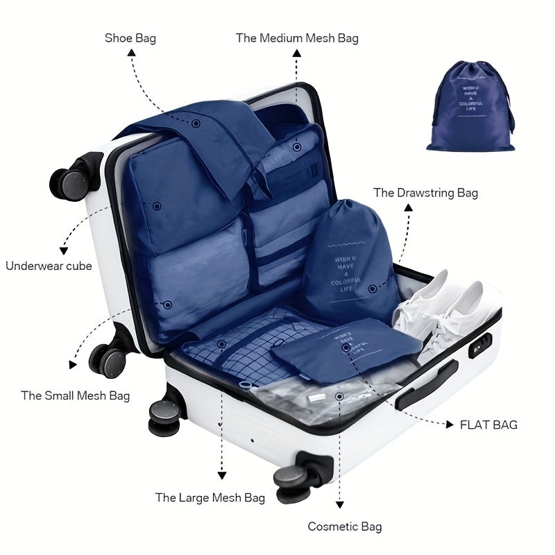 ** SUPER VALUE TRAVEL BAGS SET: Include 3 single travel cubes for clothes, 1 cube for underwear, 1 drawstring bags for dirty laundry and cosmetic, 1 make up bag for cosmetic and toiletries, 1 shoes bag for shoes, 1 small bags for socks, coins, pens, keys etc. They can make your luggage neat and order, make you have a easy, comfortable travel experience.
