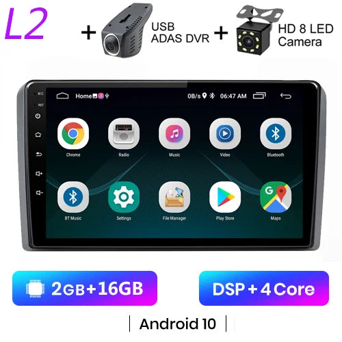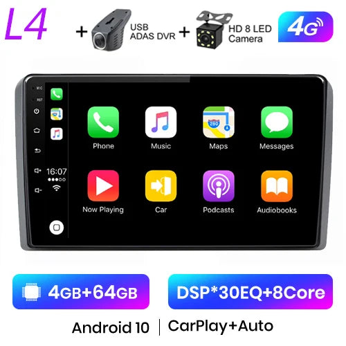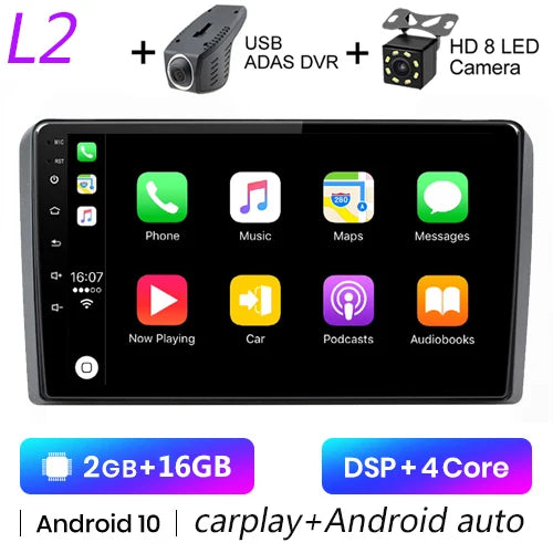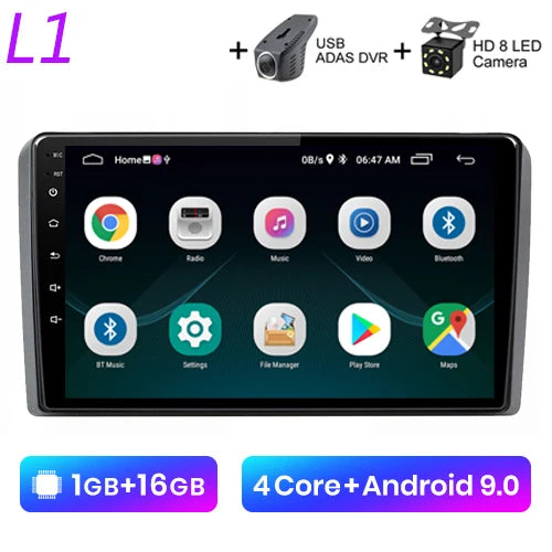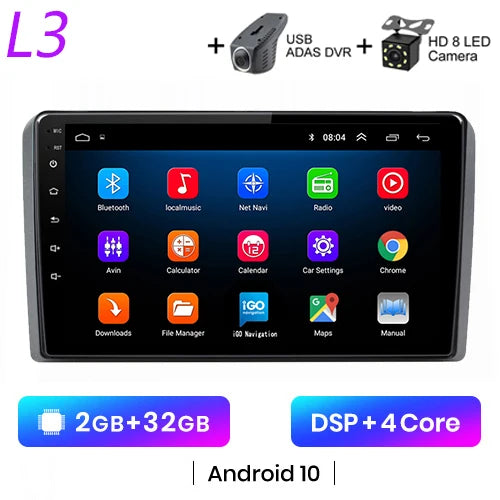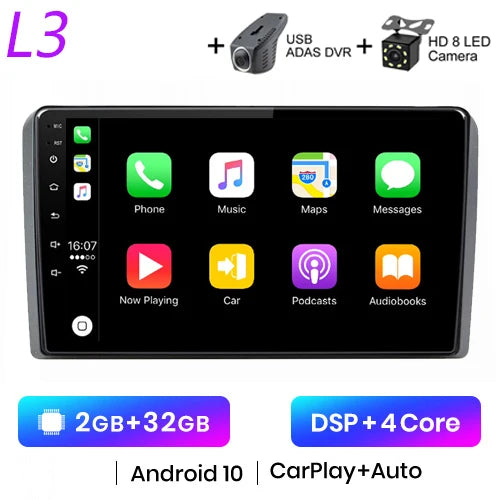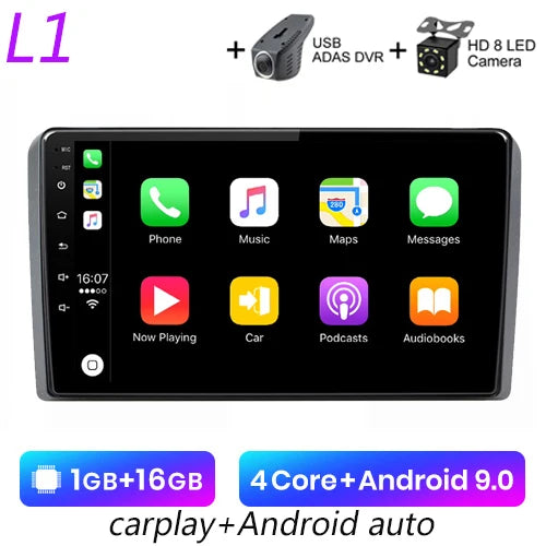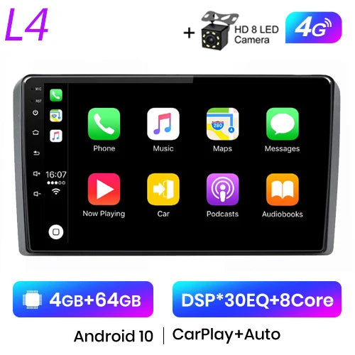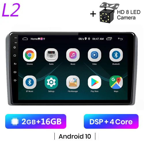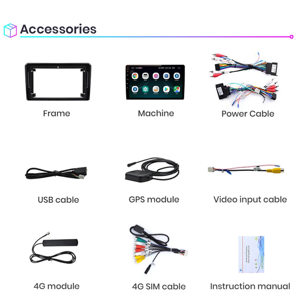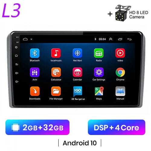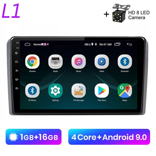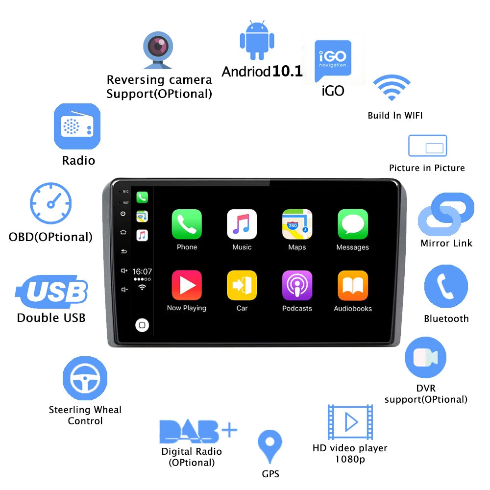 > Basic functions: Android 10.0 + 9 inch IPS Screen + Quad Core 1.2GHZ (Eight core 1.8GHZ optional)+ DDR3 1GB Flash (2GB/4GB/6GB optional) + 16 GB Memory (32GB/64GB/128GB optional) + WIFI (4G Network optional)+ Mirror link+ Steering Wheel Control + RDS/DSP(optional)+Android Auto(optional)+Carplay(optional)