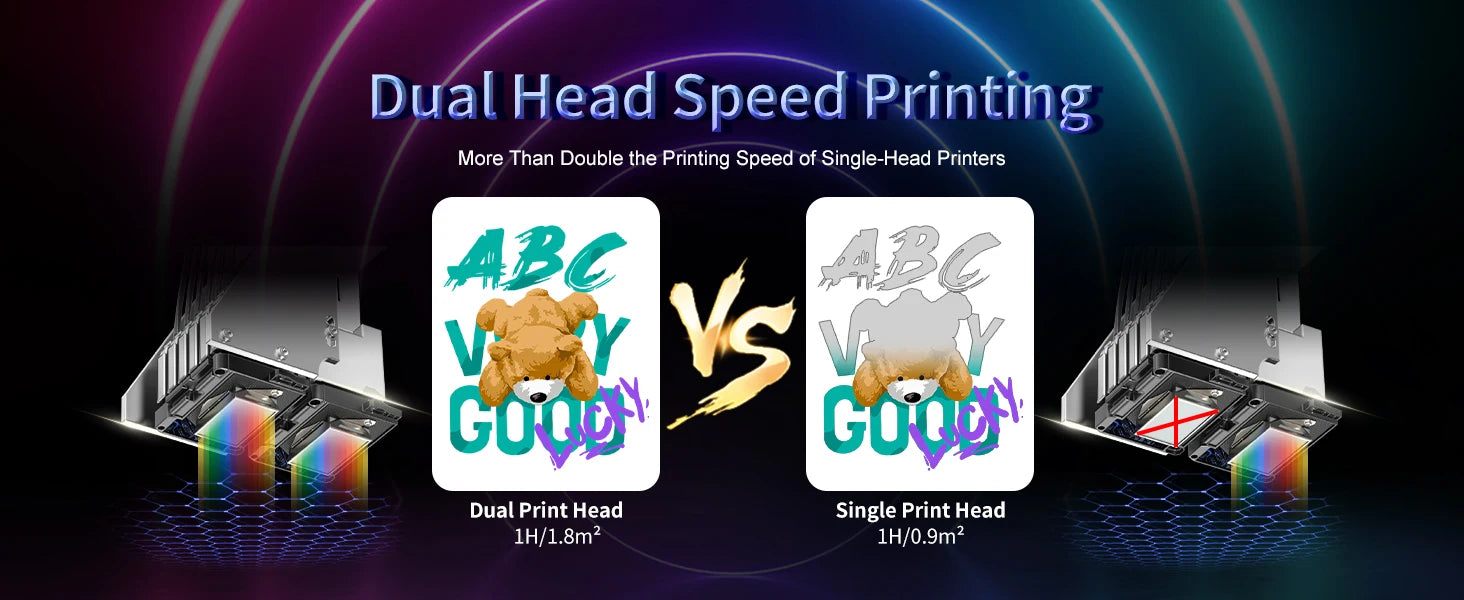 Oute packing size(LwHmm):1180(L)*650(W)*550(H)Dual Head Speed Printing More Than Double the Printing Speed of Single-Head PrintersUp to 95% color reproduction Resolution up to 2880 dpi,Clear and delicateAdvanced Printing Platform Vacuum for flat film and print head protection; heating for controlled