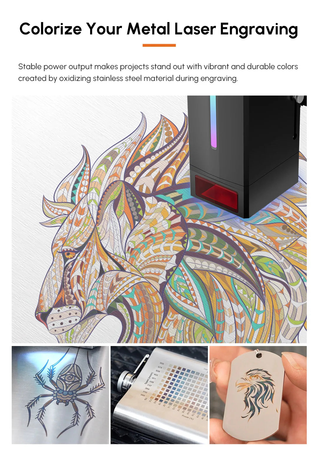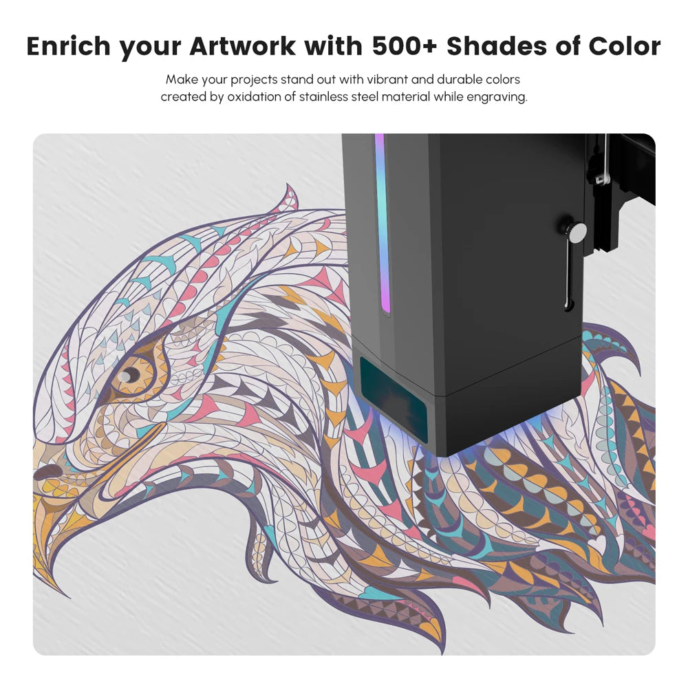 40W laser beam carries more energy, produces vibrant colors on metallic surfaces.The super powerful laser beam oxidizes the metallic surface immediately and gives the engraved metal vivid colors. Metal engraving color is no longer limited to black/grey. Your creativity will be taken to the next level with over 500 colors.
