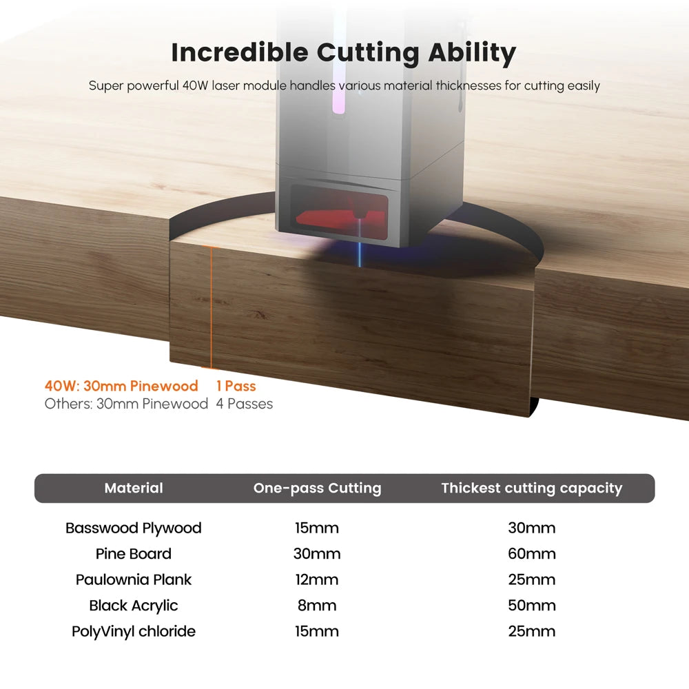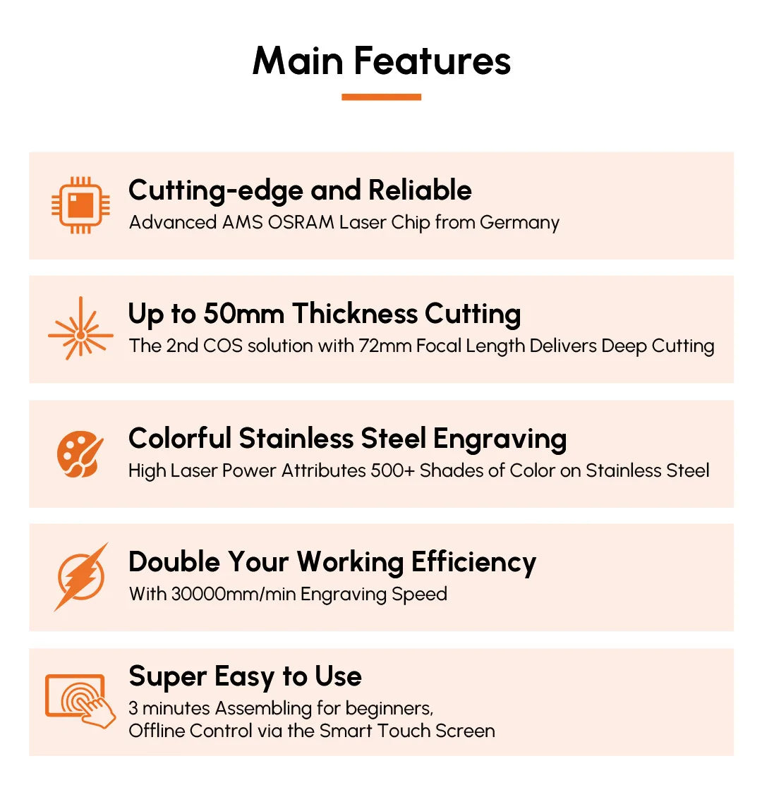 Adopting the advanced second-generation COS technology, the polarized beam combination improves the performance of the laser beam by 40%. This improvement will reflect itself specially on the cutting performance, allowing a maximum cutting thickness of 50mm of soft pine wood, 50mm black acrylic, 15mm MDF.