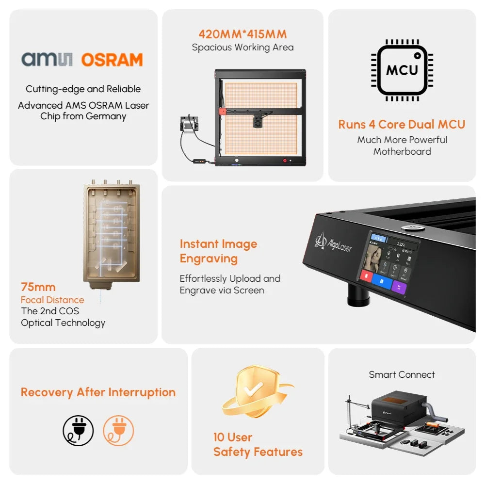 Algolaser's self-developed mobile phone APP is now available in major Android application markets and Apple APPstore (The APP is downloadable via scanning the QR code from the manual as well). Mini size and multi-function, bringing you a fresh control experience, come and have a try!Able to create the engraving tasks with the images from mobile album, instant photoing or files from SD card, we provide 32GB built-in SD card with 32-bit motherboard. The engraving speed is more than excellent!!!