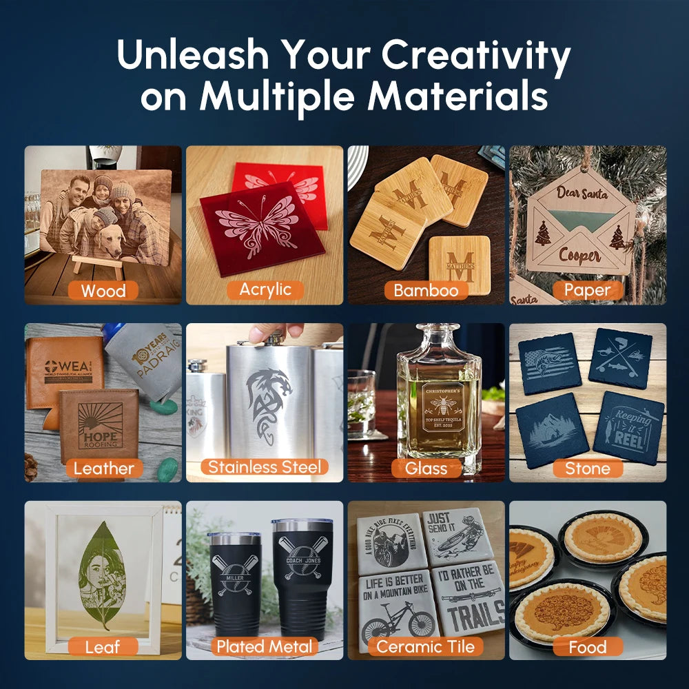 Available Materials of Engraving:Wood, Paperboard, Black Acrylic, Leather, Some Plastic(opaque), Power Coated Metal, etc.