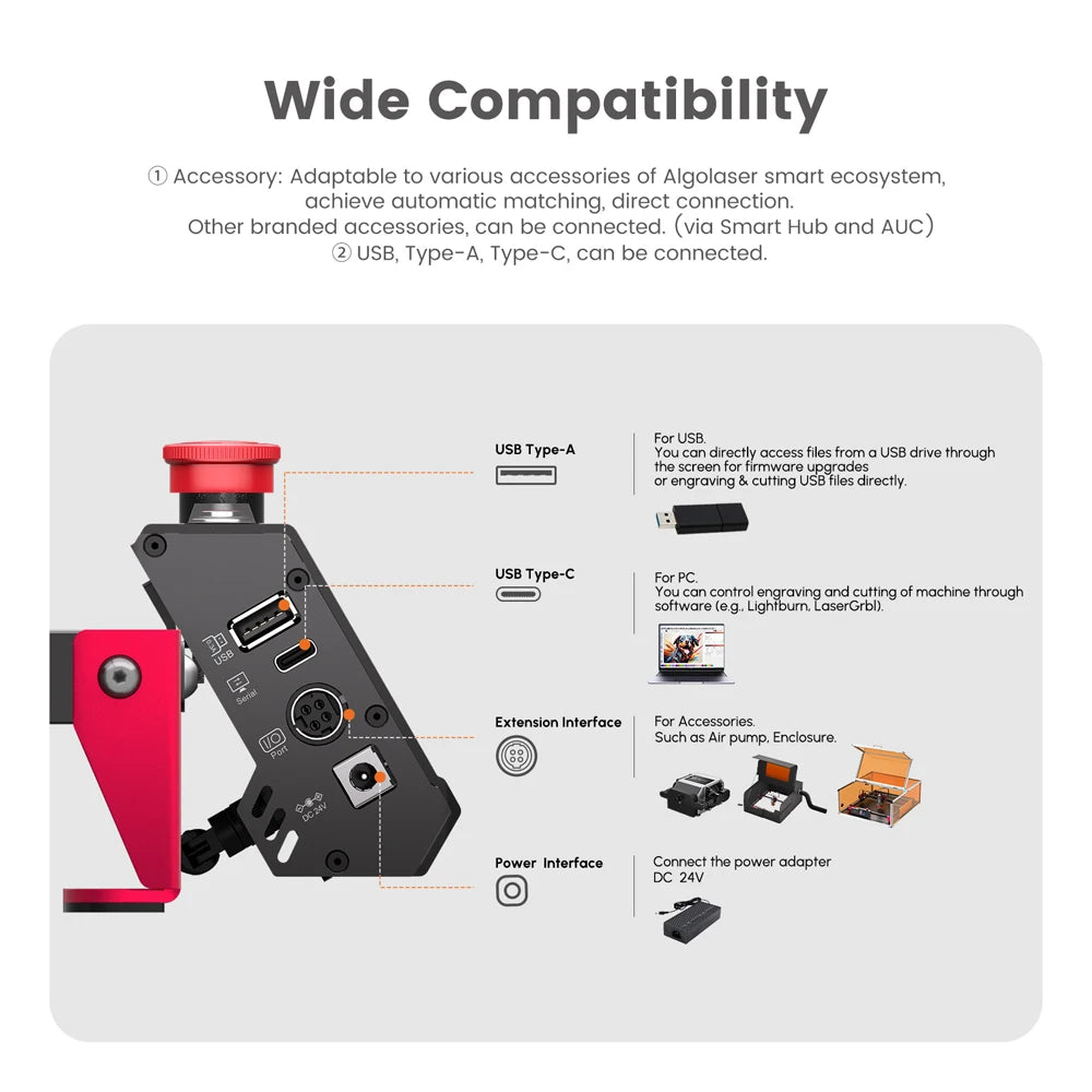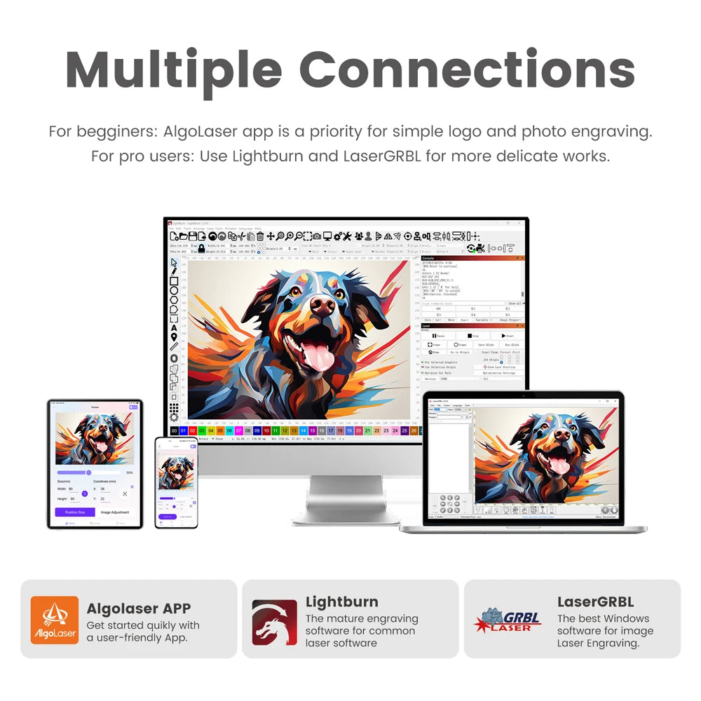 Powerful Compatibility - AlgoLaser DIY KIT MK2 Supports offline connection via WiFi-2.4 GHz and TF card (built-in 8G); Supports wired connection via USB Type-A & Type-C; Supports USB stick connection (LaserGRBL/Lightburn software). It supports import with BMP, JPG, PNG, DXF, AI, SVG file format and so on.