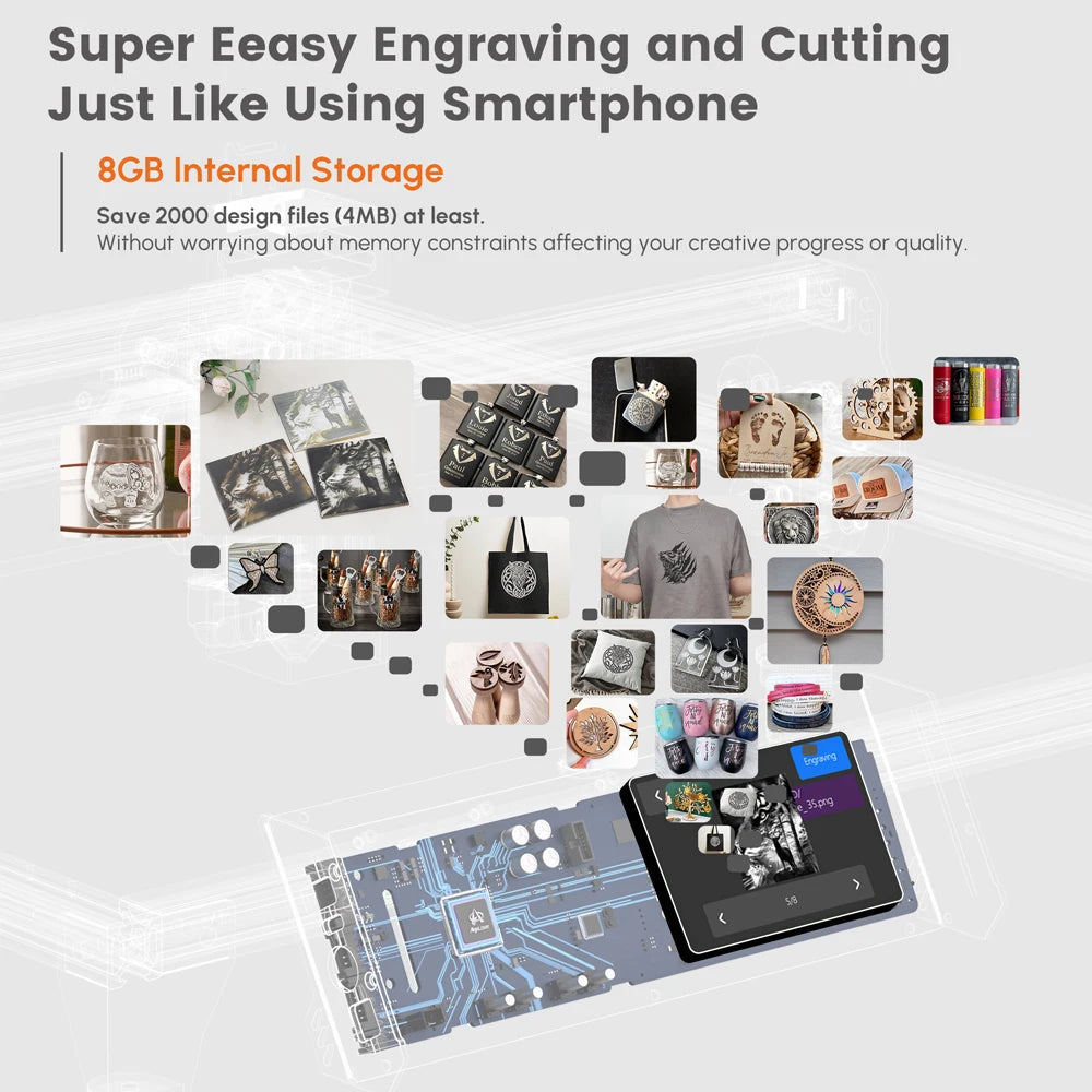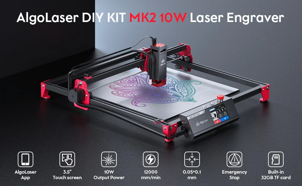 3.5'' Colorful Touch Screen - Embedded the screen in the AlgoLaser DIY KIT MK2 laser engraver, it has a friendly user interface and friendly experience. It cut multiple pieces of plywood or images to be engraved without tying up your computer to run it. And support save the gcode file into TF card and engraving without computer connected.
