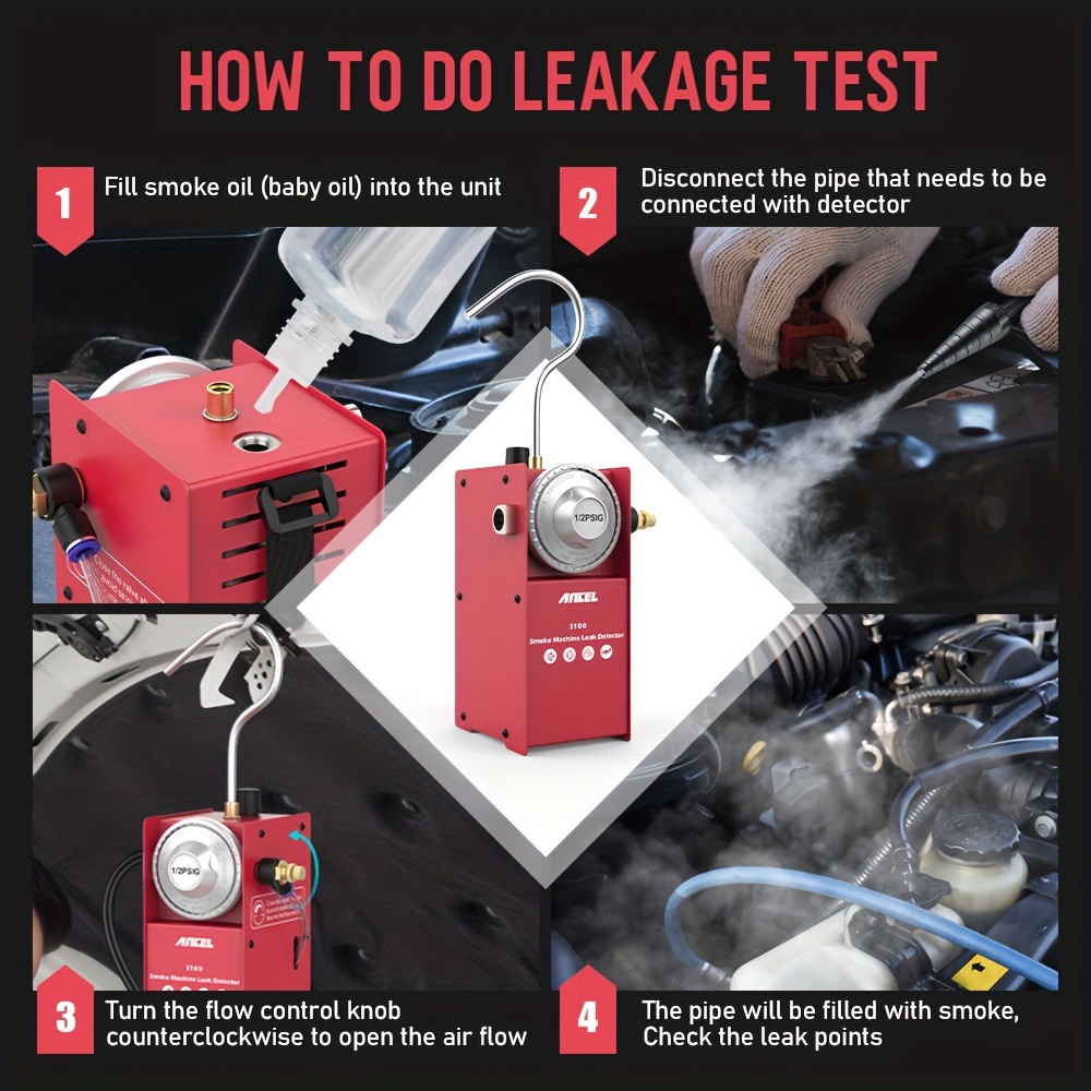 The S100 smoke leak detector can do the following work - EVAP systems test, vacuum leaks, low pressure turbo leaks, intake manifolds, cooling exhaust systems, door & windows seals, EGR system test, various pipe fittings test, oil leaks, and more!