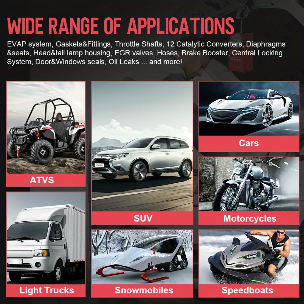 For detecting the leakage of pipe systems on cars, motorcycles, snowmobiles, off-road vehicles, ATVs, light trucks and speedboats boats.Works on all car makes and models.