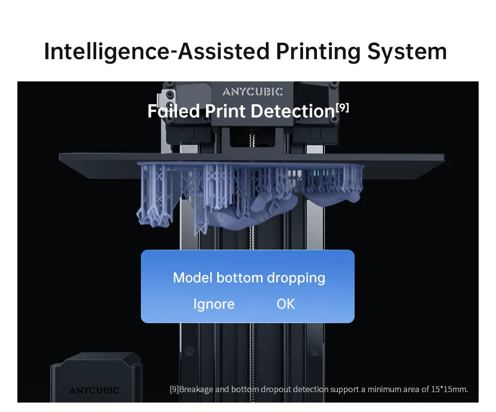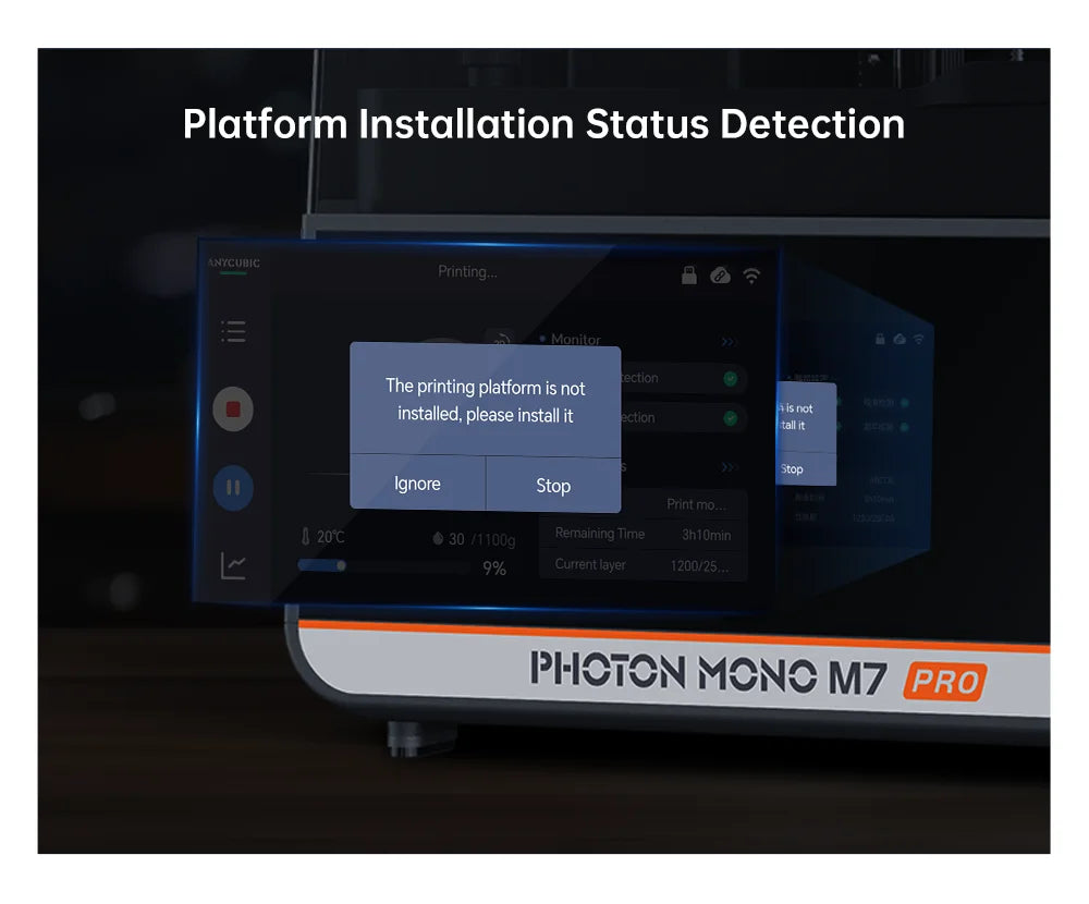 During the printing process, if the model experiences issues such as layer fractures, bottom detachment, or detachment, printing automatically stops and a pop-up alert is issued, allowing users to adjust the printing task promptly, avoiding wasted resin and time.