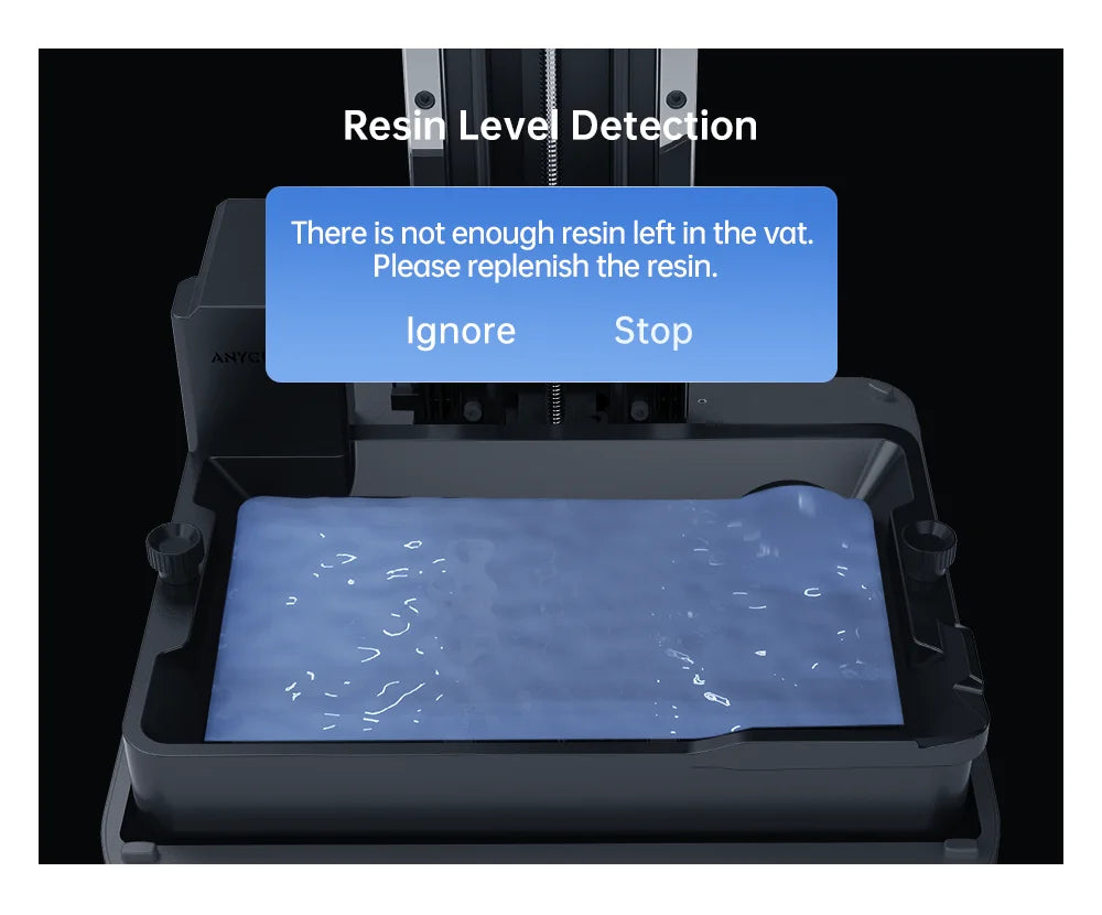 When the resin level in the vat is below the amount required for slicing printing, users are reminded to refill it promptly.