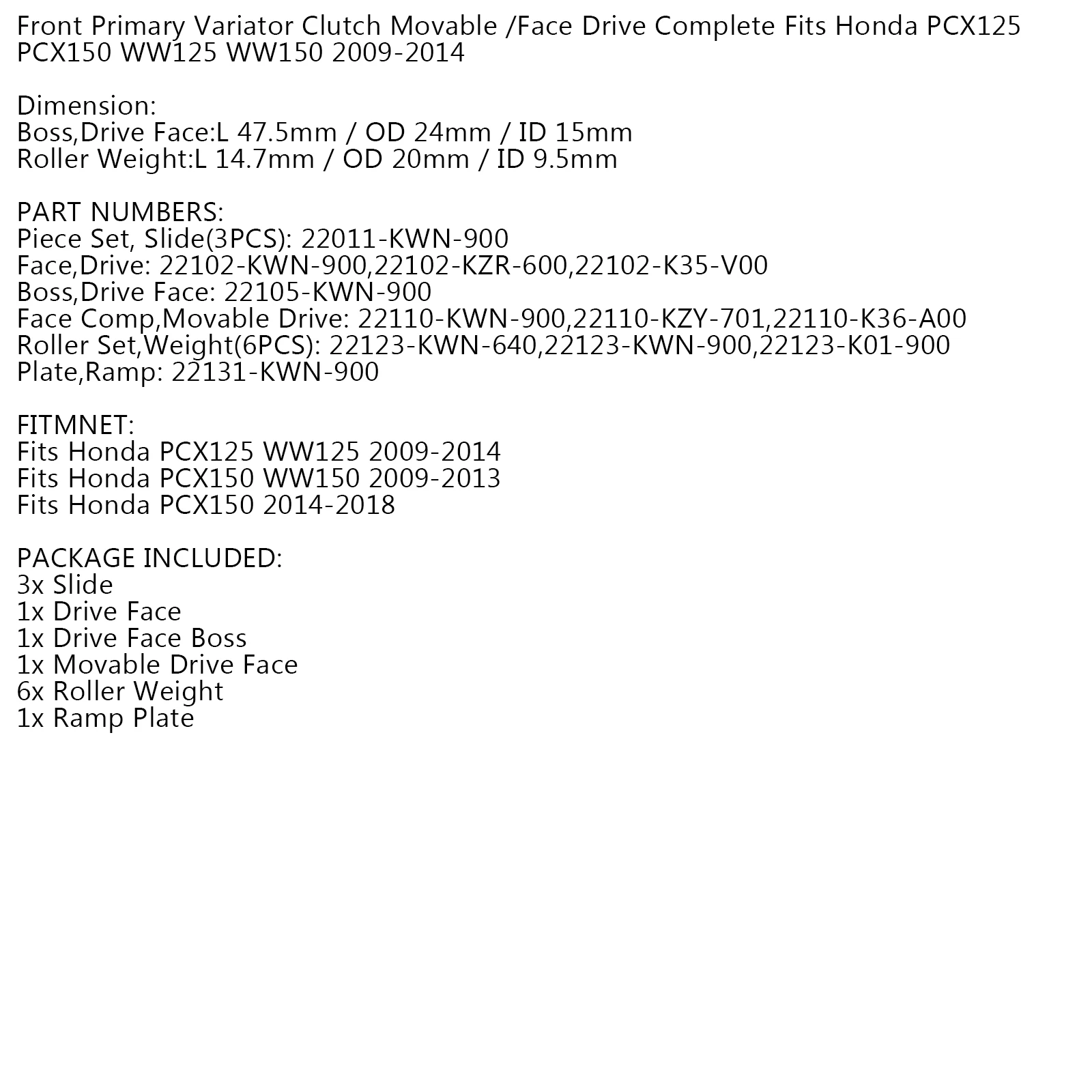 Front Primary Variator Clutch Movable /Face Drive Complete Fits for Honda PCX125 PCX150 WW125 WW150 2009-2014