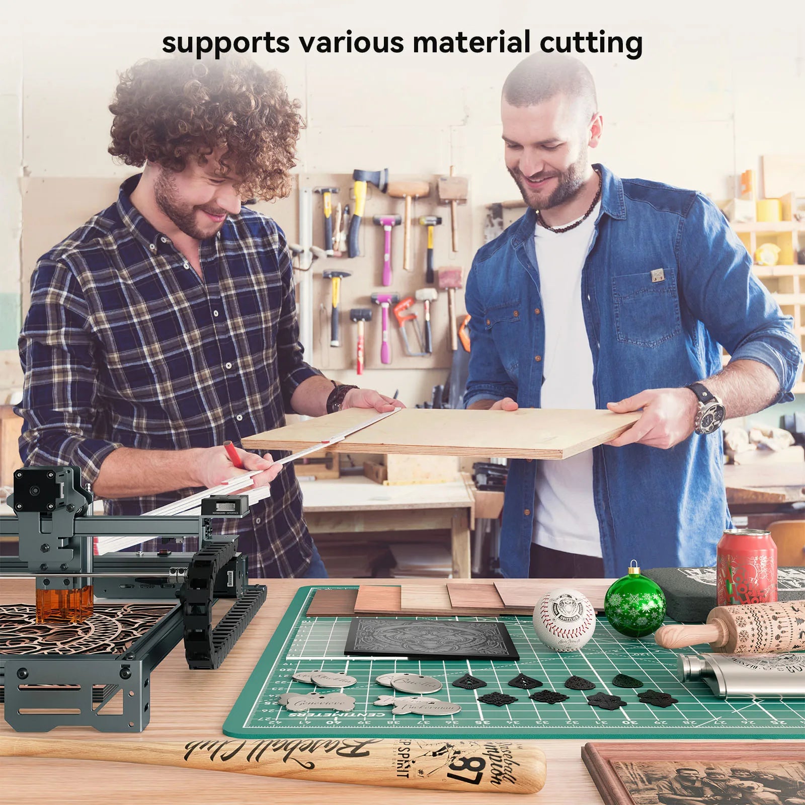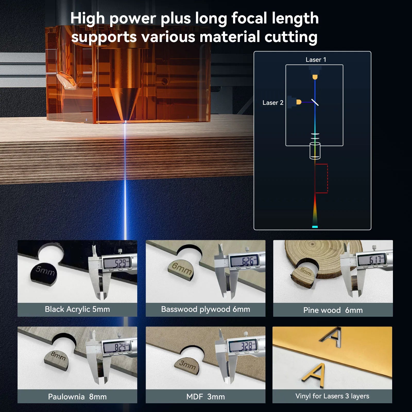 【Fast Engraving Speed & Strong Cutting Ability】This laser engraver machine has a built-in screw rod and a long focal length. The laser cutter has 60000mW power and combines high-energy cutting and precision engraving simultaneously. The engraving speed can reach 400mm/s, which significantly shortens the engraving time and can easily process various materials