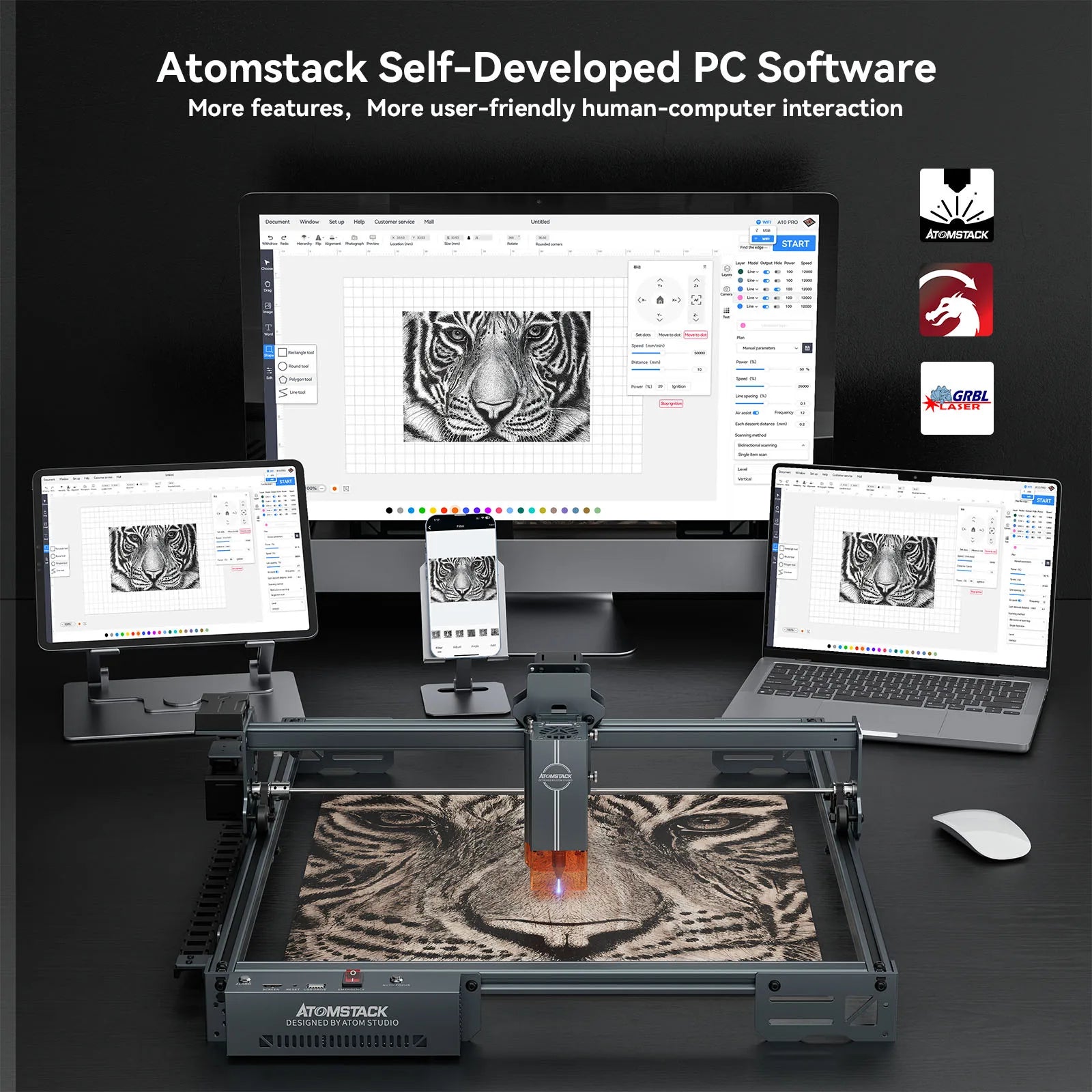 【Extreme Expandability & Rich Selection of Accessories】The metal laser engraver can be connected via Type-C and USB cables. In addition to Atomstack's self-developed app and PC software, it can also be connected via Lightburn, LaserGRBL, and other software for configuration and control