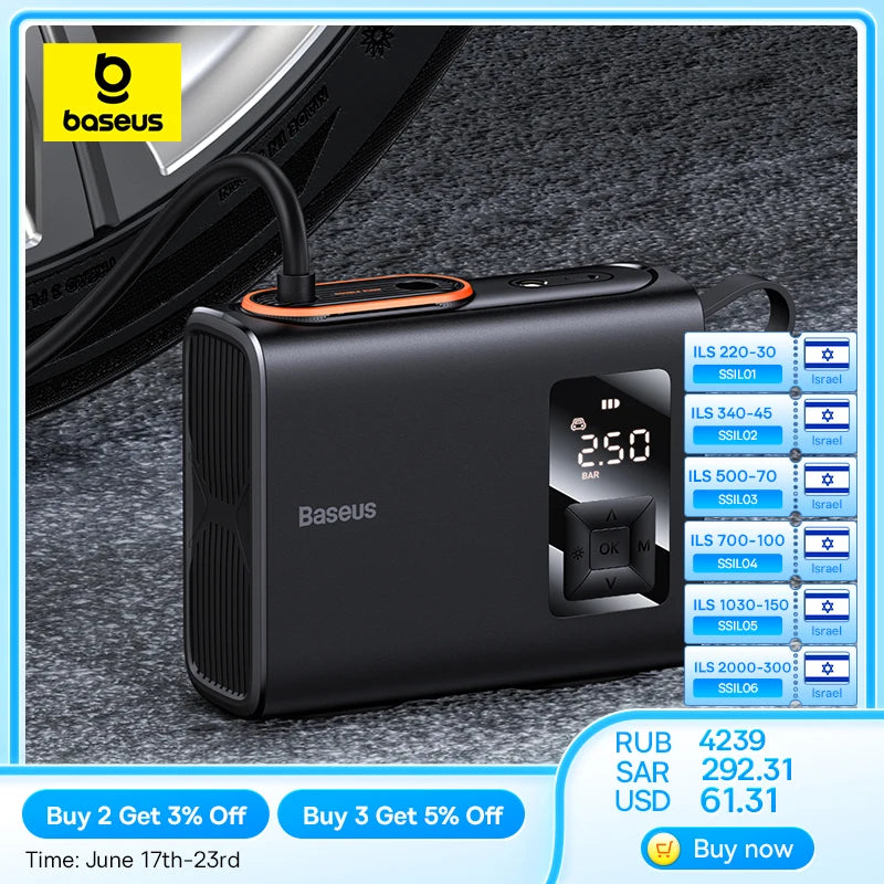 Baseus Tire Inflator Portable Car Air Compressor 250W Dual Cylinder Electric Tire Pump For Car Motorcycle Bicycle Tyre Inflation