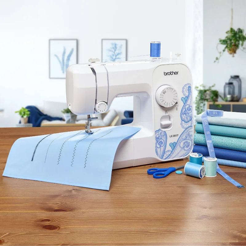 The Brother LX3817 17-Stitch Full-Size Aqua Sewing Machine is a welcome addition for your sewing studio or crafting room. It's straightforward to use and suitable for everyday tasks. This Brother full-size sewing machine's versatile features include a blind hem stitch, four-step auto-size buttonhole, zigzag, and couching options. Selecting a mode is as easy as turning the dial, and the included instructional CD takes you through how to set up and use your unit. The LX3817 has four quick-change sewing feet; a zigzag foot, a zipper foot, a buttonhole foot, and a button foot, so creating one-of-a-kind outfits or home décor pieces just got more creative. The upper thread tension control knob helps you adjust the thread tension to suit your fabric and project, so you avoid too loose or too tight, or puckered results. Lightweight, portable, and compact; this Brother full-size sewing machine is excellent for taking classes and is easy to store at home. It makes a thoughtful gift idea for a birthday, holiday, or any other occasion.