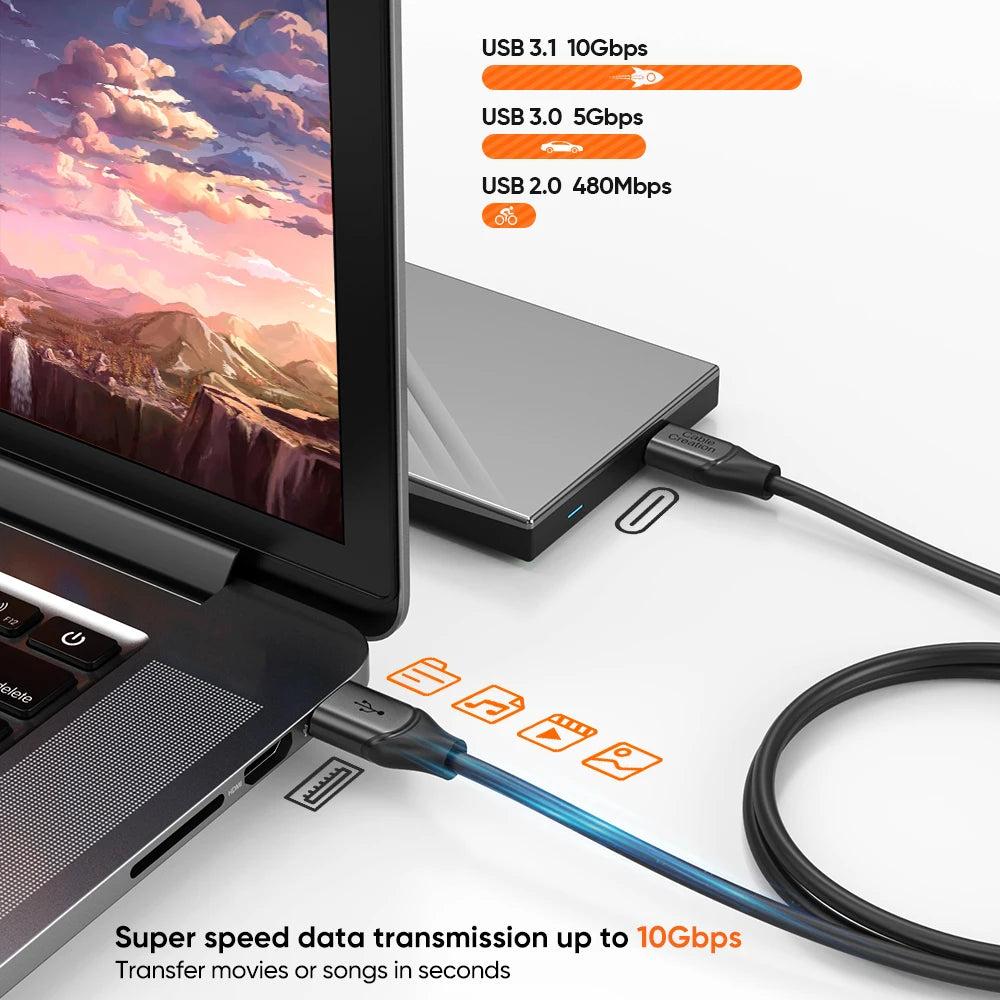 USB 3.2 10Gbps Data Transfer - Gen2 USB 3.2 Type-A to Type-C Cable supports super speed data transmission up to 10Gbps. You can transfer HD movies or songs in seconds with your USB C SSD (Note: This cable does not support data transfer or charging between two laptops, nor does it support video output, USB 3.2 is backwards Compatible with USB 3.1, USB 3.0, USB 2.0 )