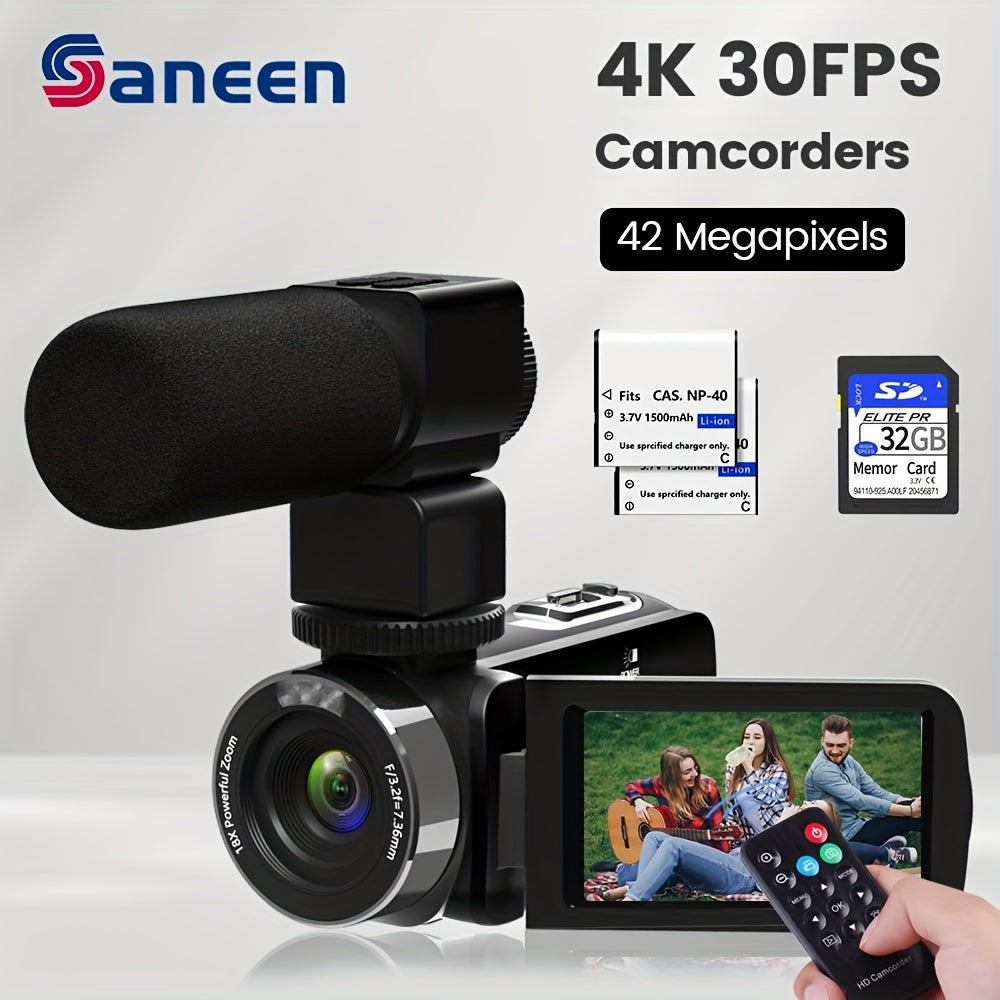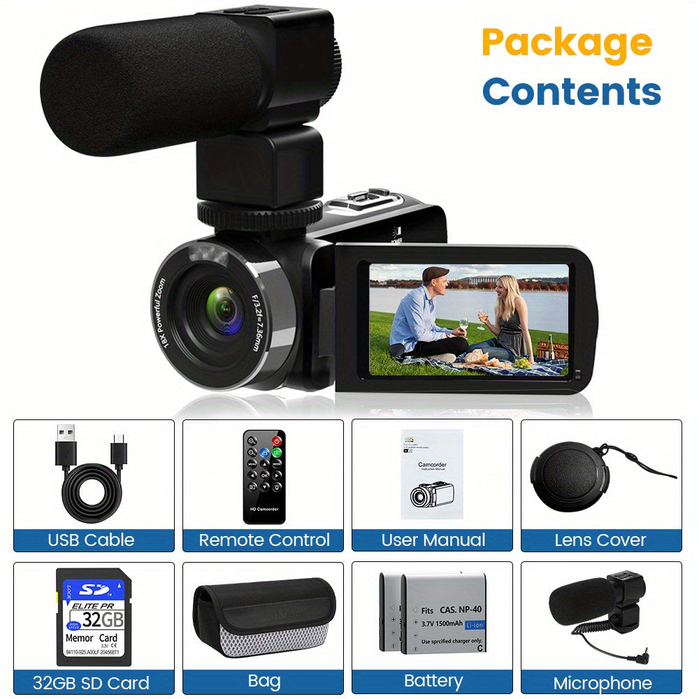 【Perfect Gift】: Our multifunctional camcorder makes the perfect gift for anyone! Package list includes 4K camera *1, 32GB SD card *1, 1500mAh battery *2, remote control *1, Lens Cover *1, microphone *1, manual *1, USB cable *1, DV bag *1. Plus, with its sleek and stylish design, it's sure to impress!