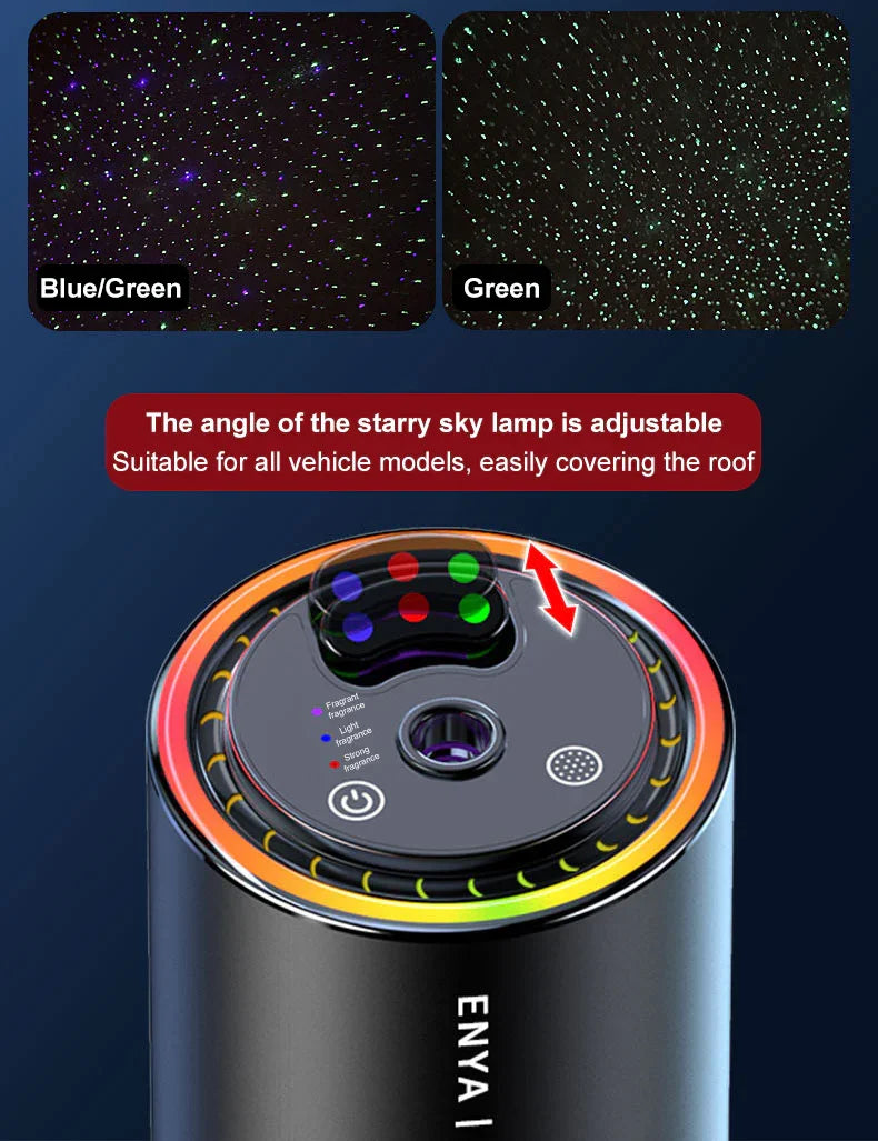 The star of the show is our 3-color adjustable starry sky dome, designed to not only refresh your car's air but also to create a mesmerizing light display that dances to the rhythm of your favorite tunes. With the Music Rhythm Light feature, your drive transforms into a symphony of scents and lights.