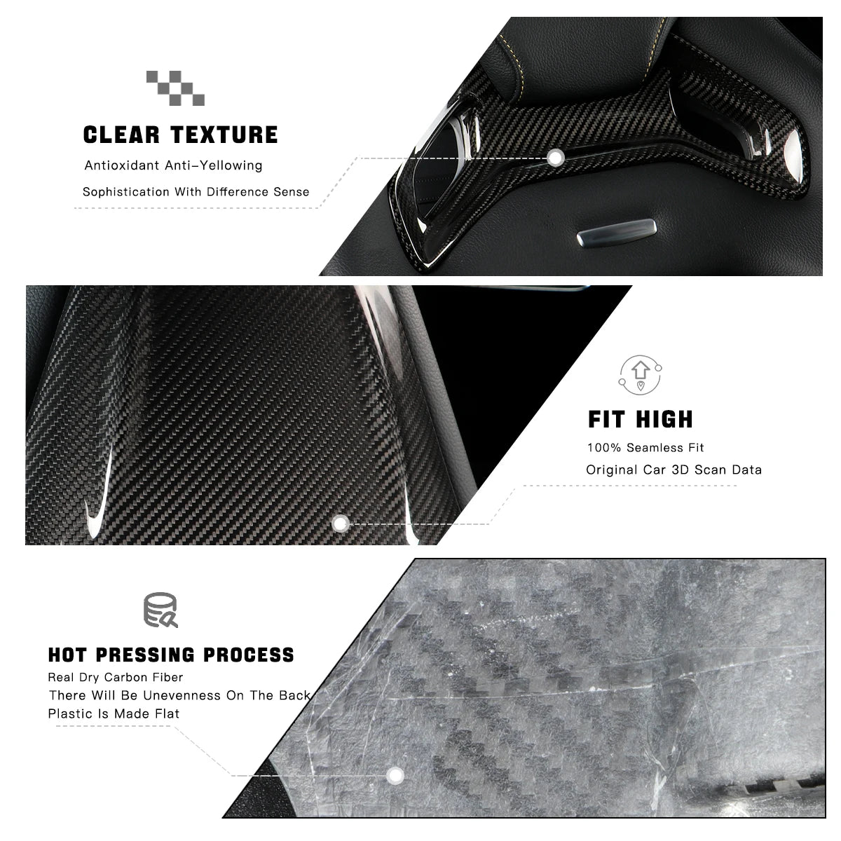 1) Made of high quality carbon fiber, dry carbon fiber hot Pressing process. Not ABS, not water transfer process.
