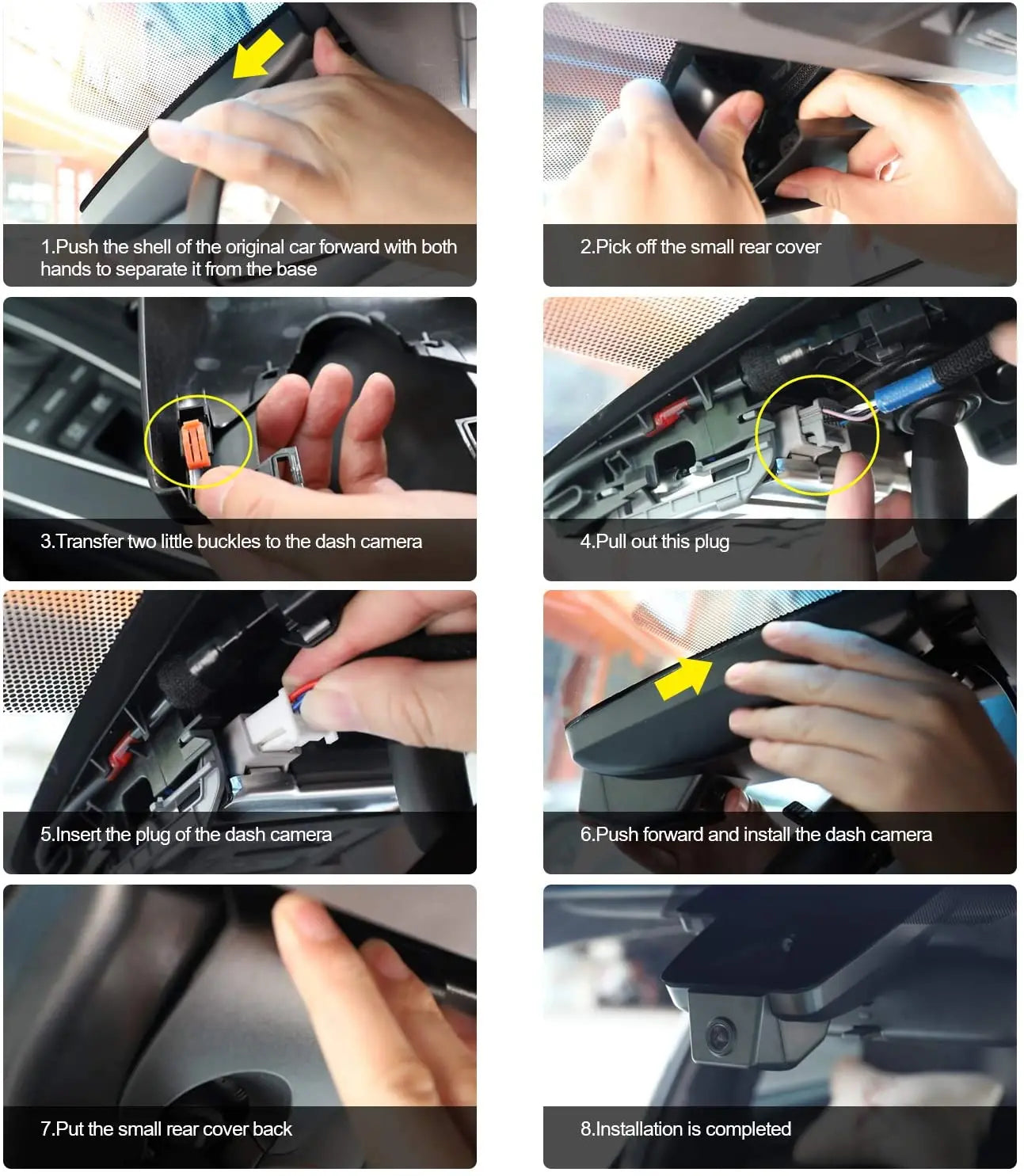 Just remove the original back cover and replace it with our dashcam and it takes a short time to install.
