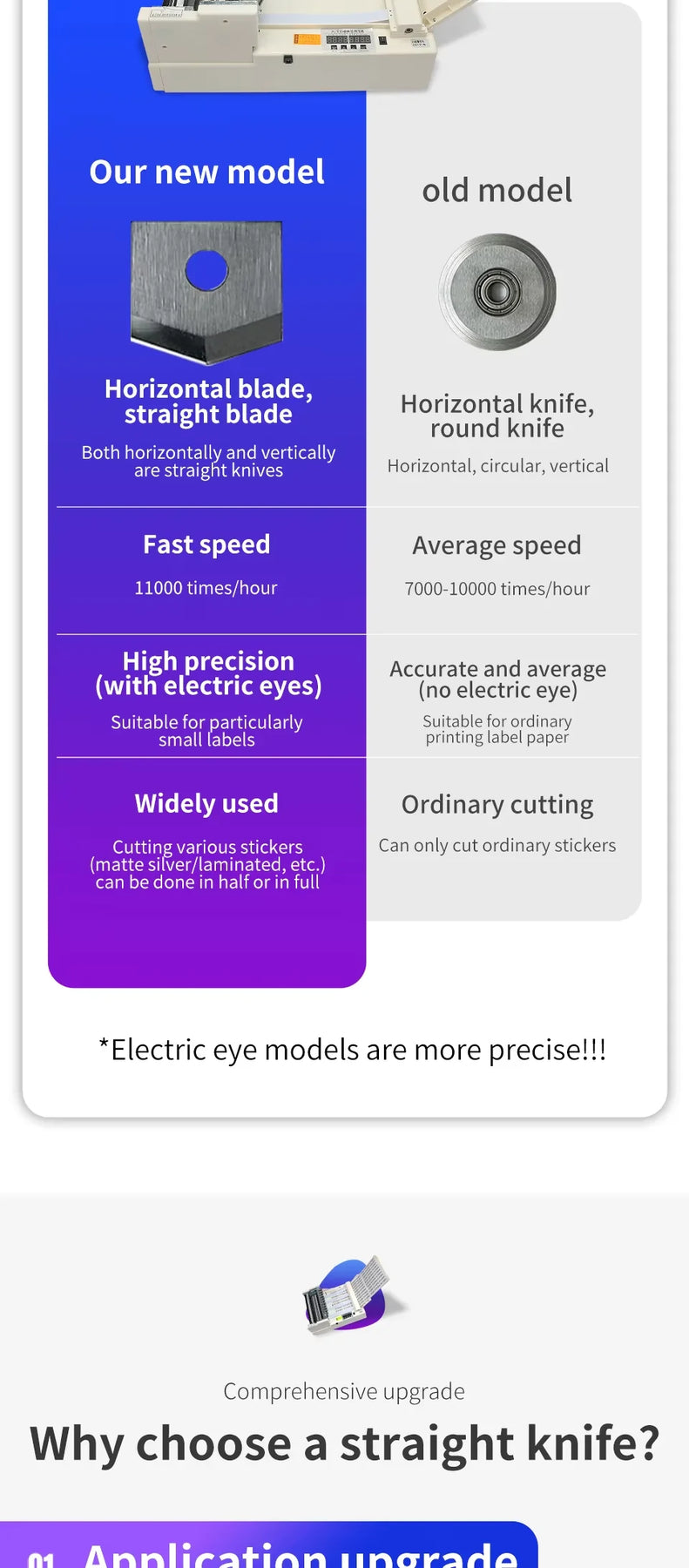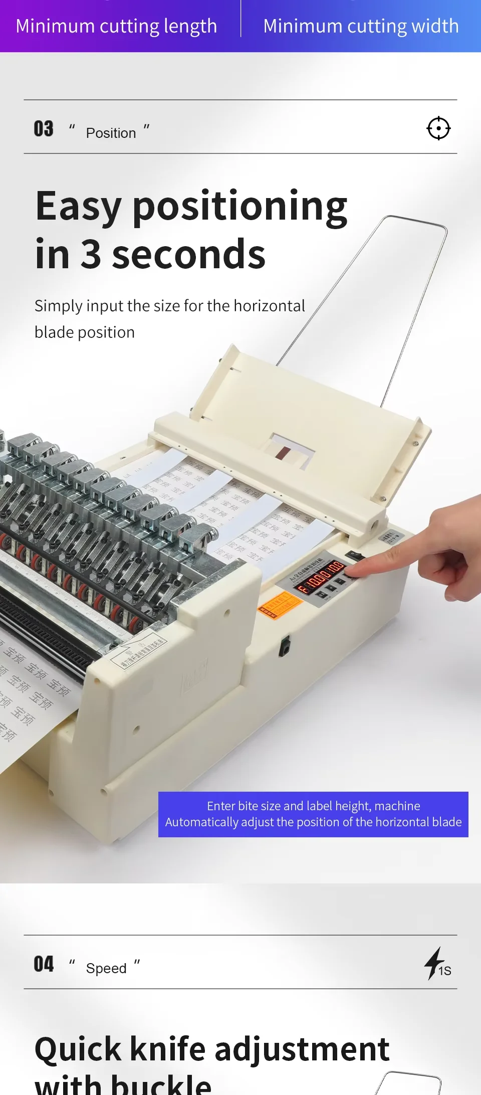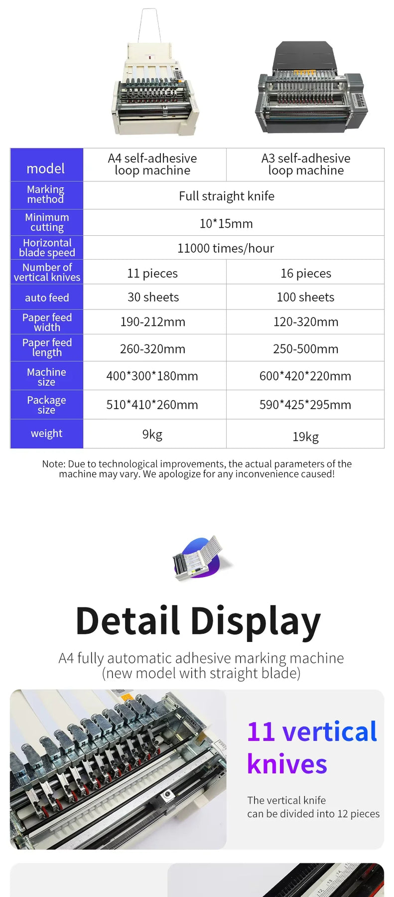 This A4 self-adhesive striping machine represents a new trend in striping cutting, with an innovative all-straight knife design, which comprehensively surpasses traditional round knife models in terms of speed, precision and applicability. Its cutting speed of up to 11,000 cycles per hour, fine cutting capability of as small as 10x15 mm, and wide material adaptability, including a wide range of self-adhesive labels and specialty papers, make it ideal for industries such as label making, graphic printing, and more. Simple operation (one press and one dial), automatic paper feeding (about 30 sheets) and excellent cutting effect (half cut/full cut are accurate without offset), effectively improve work efficiency and reduce labor costs. The compact body design is easy to place.