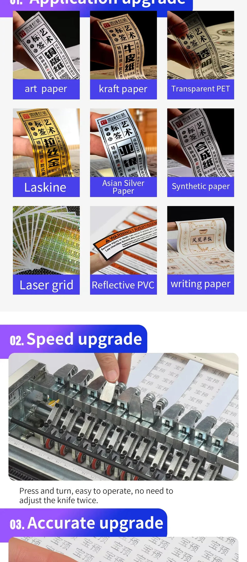 Widely applicable materials: Specially designed for cutting all kinds of self-adhesive labels, including but not limited to silver self-adhesive, PET protective film, coated self-adhesive, large head sticker, coated paper, kraft paper, transparent PET, brushed gold paper, silver paper, synthetic paper, laser graph paper, white PVC, writing paper, etc.