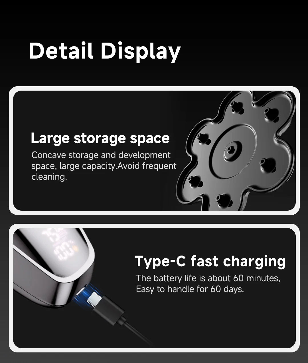 1200mAh battery, charged once, with a battery life of about 60 minutes, shaving for 1 minute every day, easy to use for 60 days, meeting daily shaving needs.