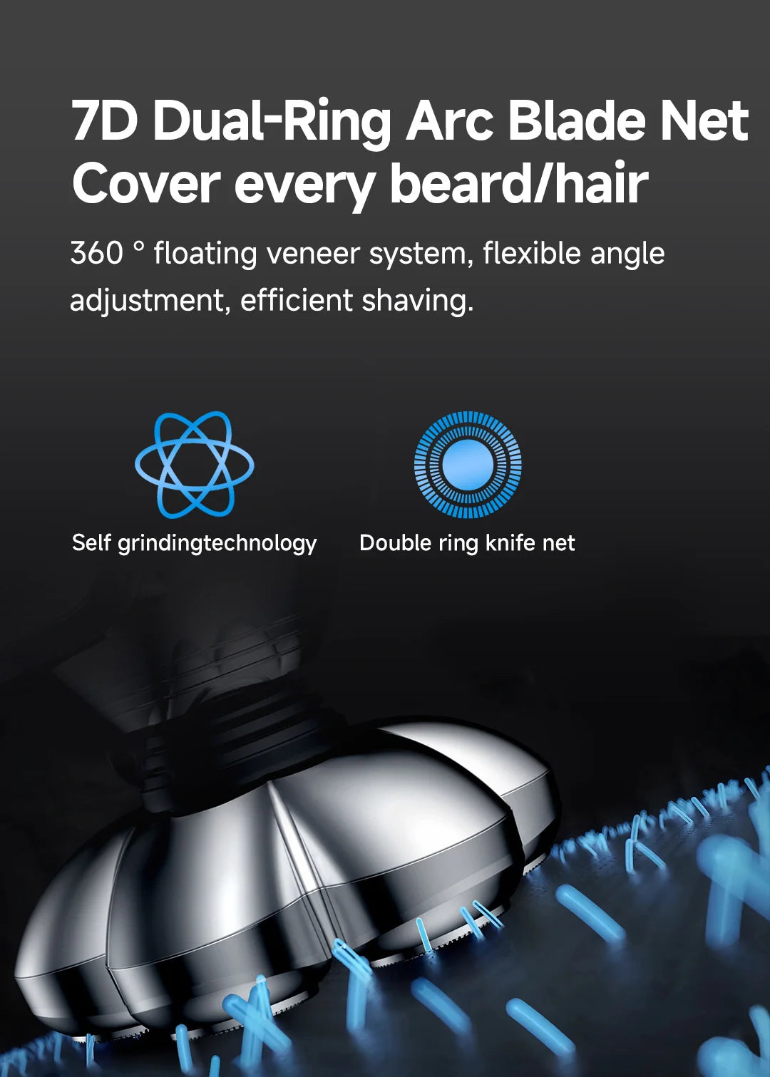 7D curved blade mesh: 360 ° fit to the face, large area shaving, higher efficiency.