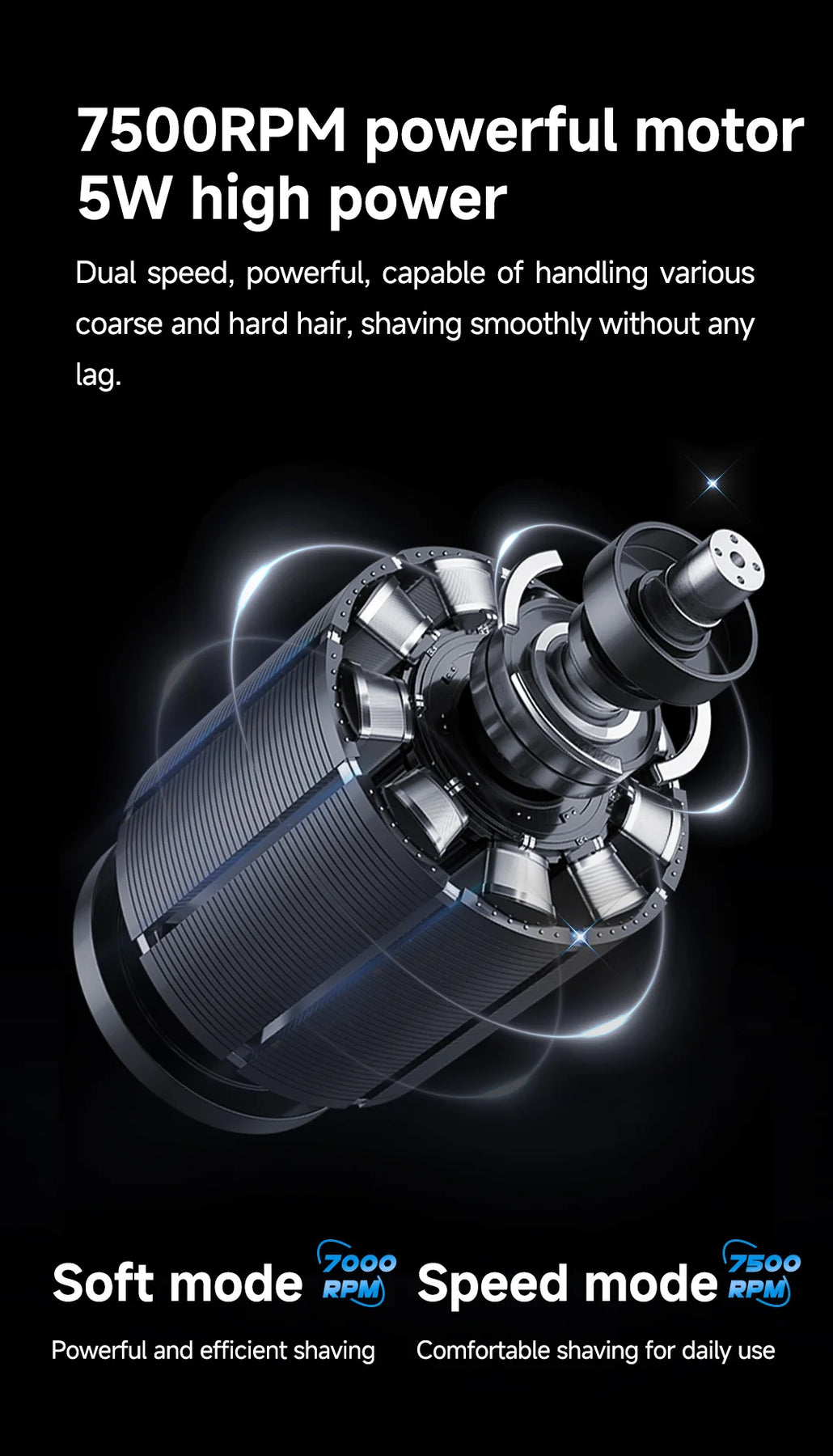 7500 RPM motor: Shaving is fast and smooth, reducing irritation.