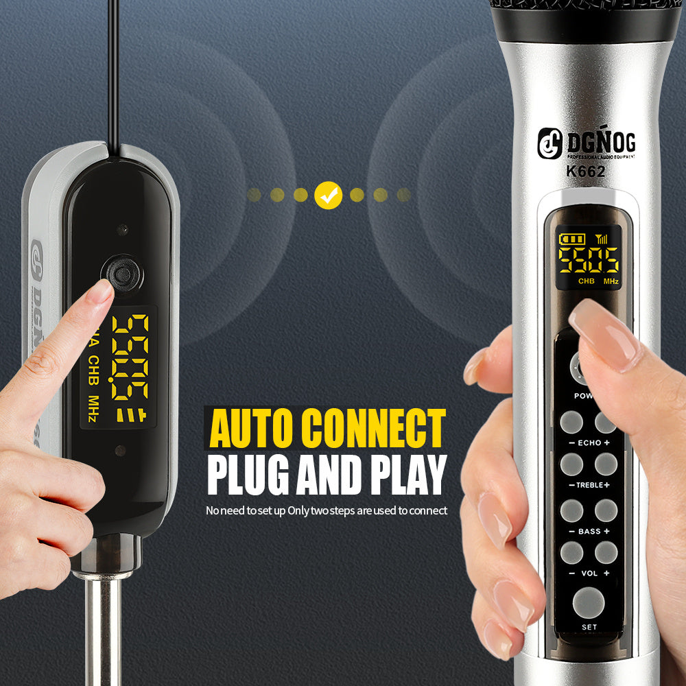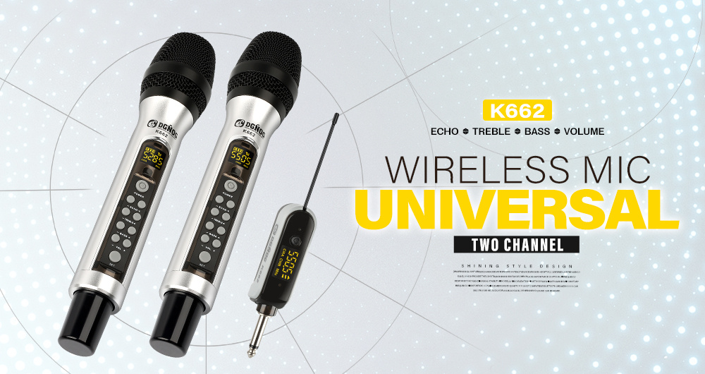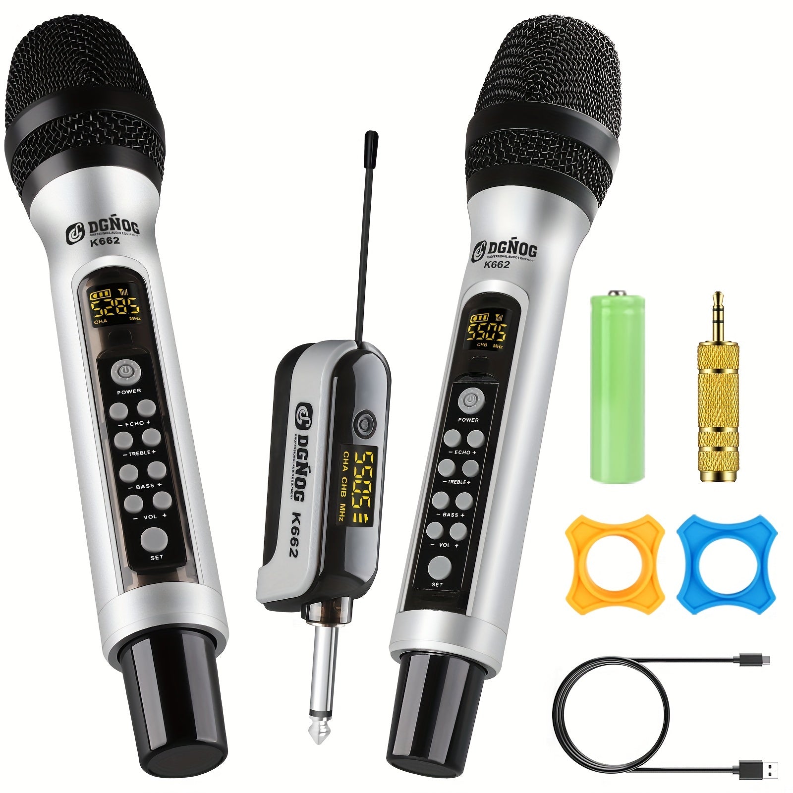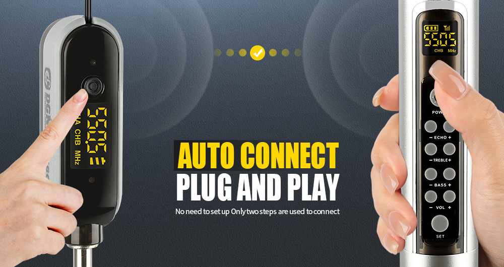 【Wireless microphone system with echo/treble/bass/volume】: The wireless karaoke microphone set has echo, treble, bass, volume control button, you can use different sound effects according to different songs. ●The wireless mics have 60 channels, each 30. Short press the SET button to adjust channel to avoid interference.