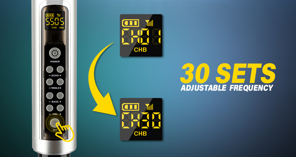 Click the SET to adjust the channel, each mic has 30 channel, Max 15 Sets Using Simultaneously
