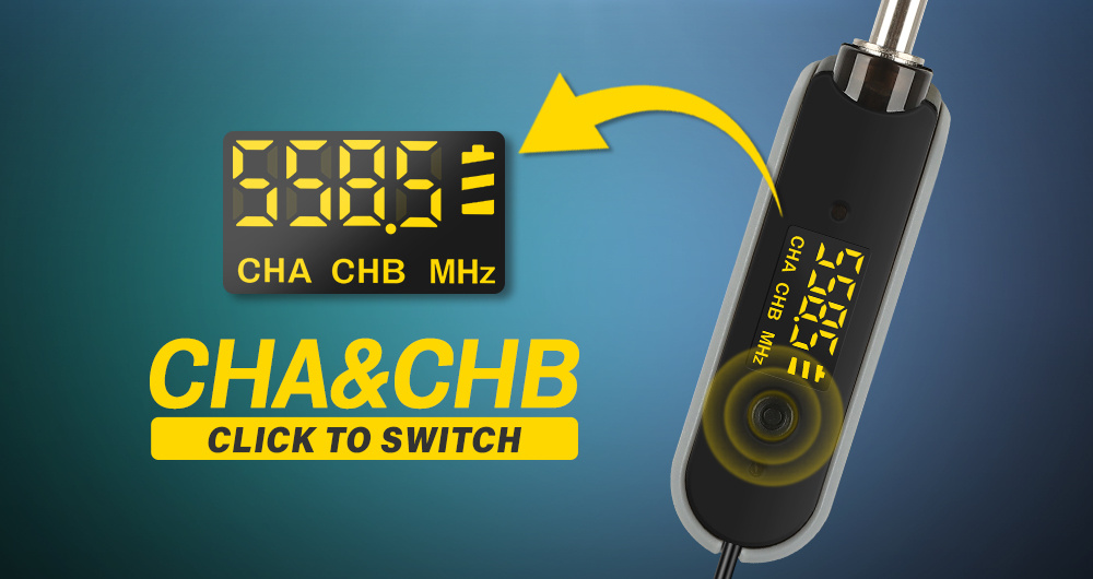 Long press the power button to ON/OFF, click the switch to display the CHA/CHB frequency