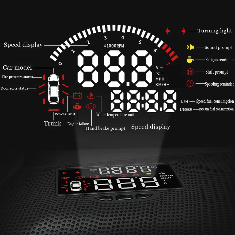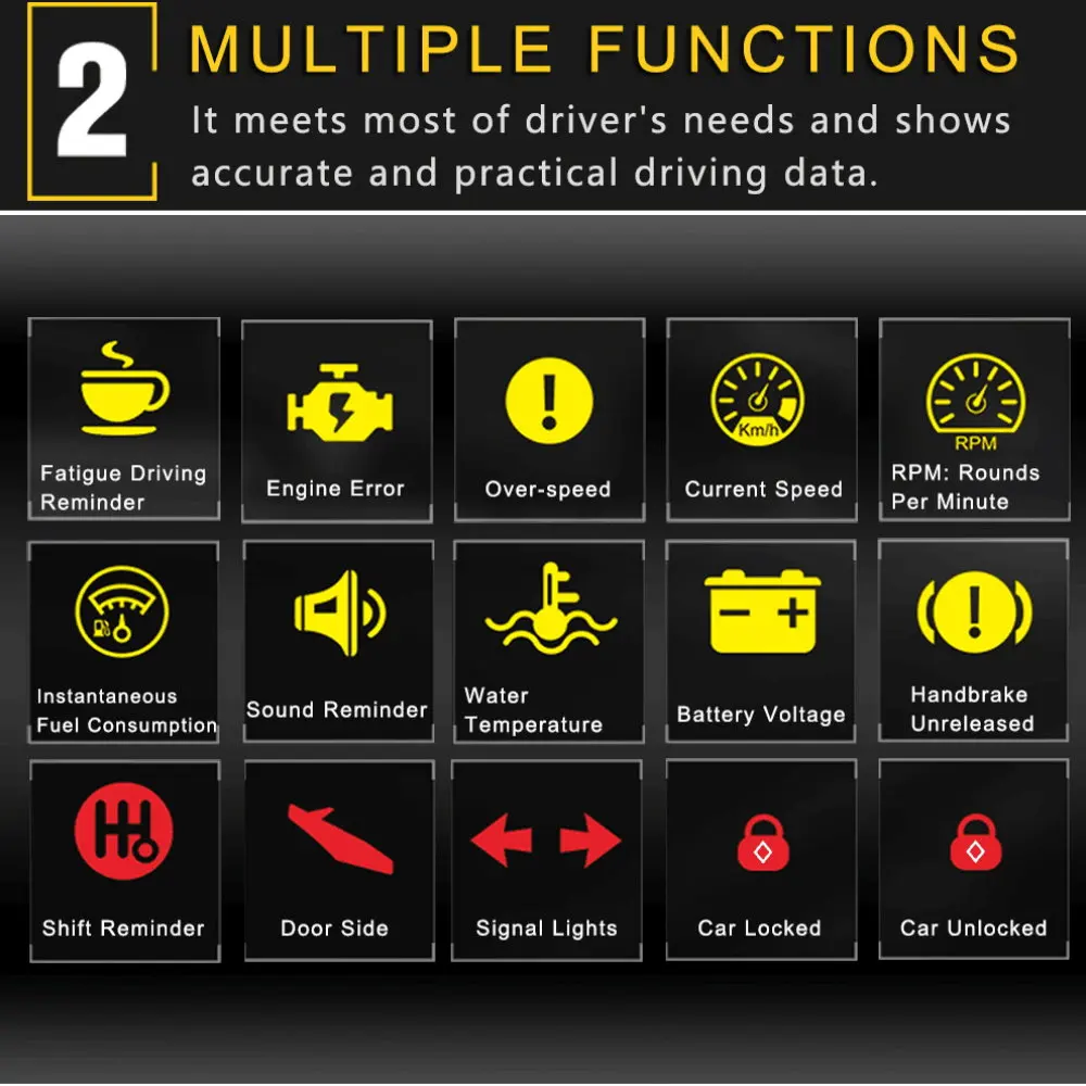 Real Speed, Clock, RPM, Fatigue driving reminder, Voltage unit(V), Turn Signal prompt, Rotating speed, Warning of high water temperature, Engine abnormality, Hand brake is not put, Voltage, Water Temperature, etc.