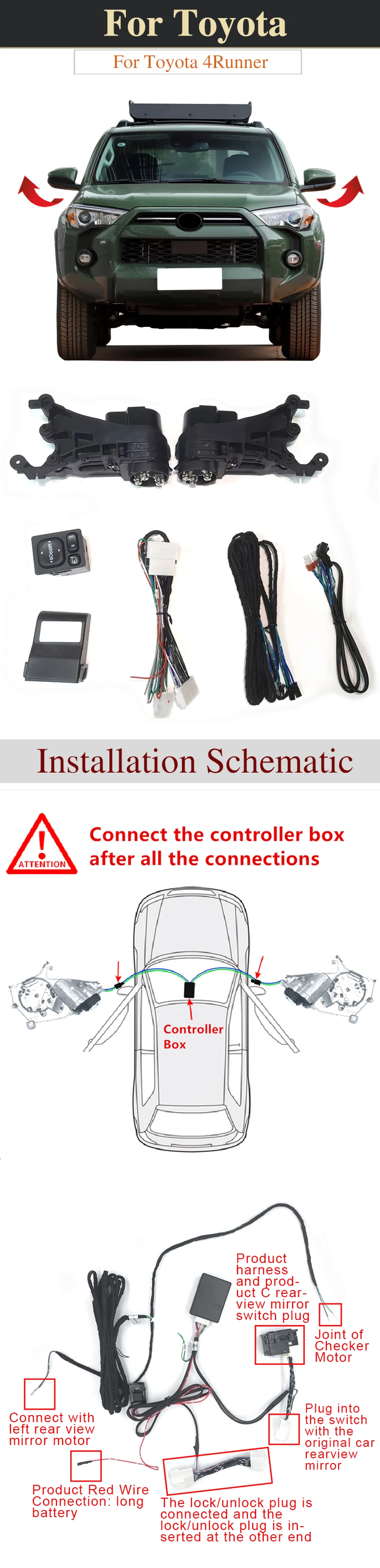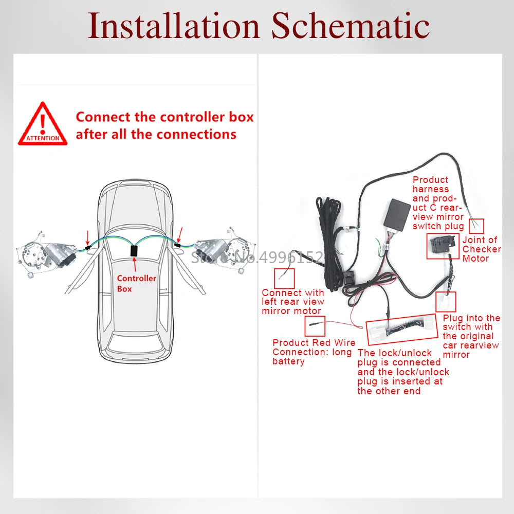 Installation: Connect the motors inside the mirrors, and connect the cables to the plugs inside door panel. If you need the instruction, please contact the service, thank you.