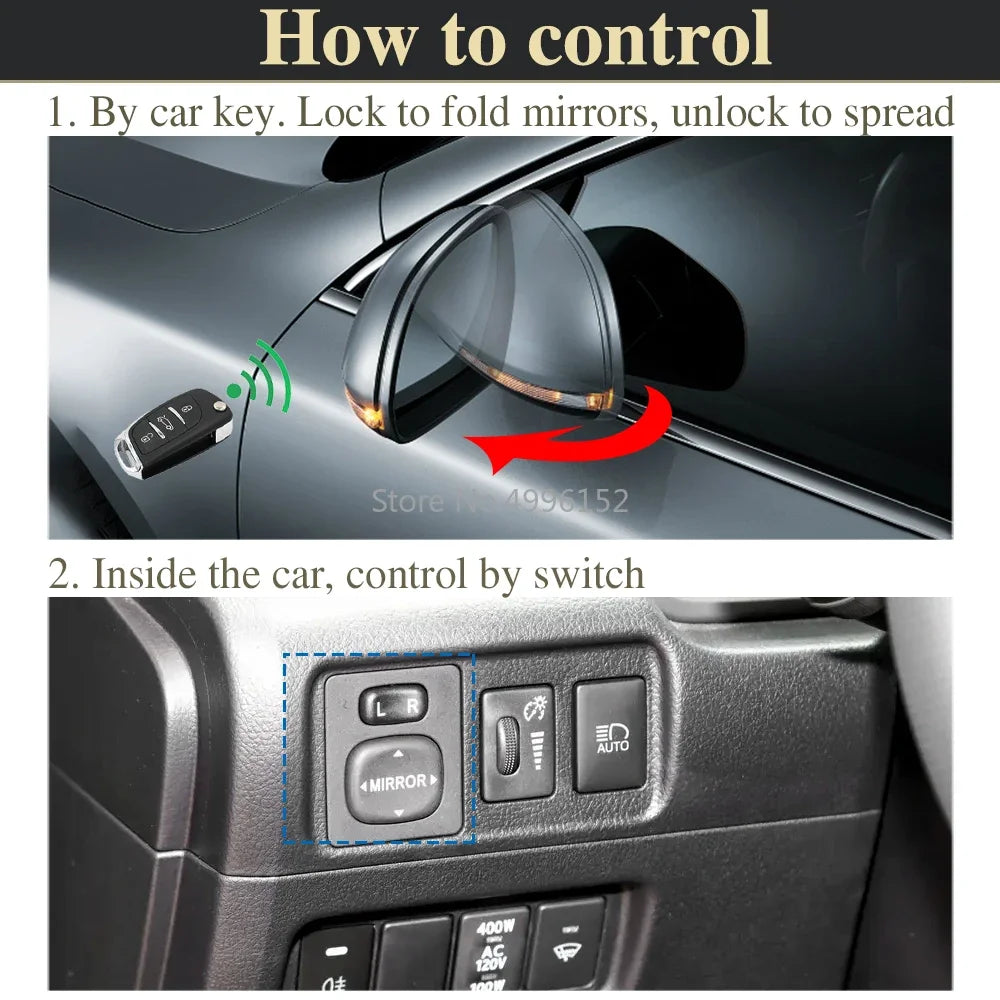 Functions: After installation, the mirrors can be folded and unfolded inside the car(by the door lock keys) or outside the car (by remote key fob).