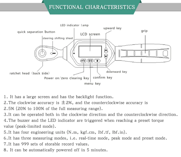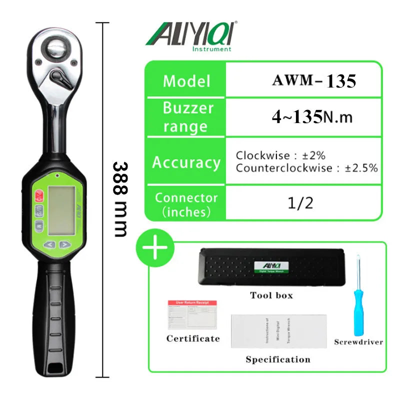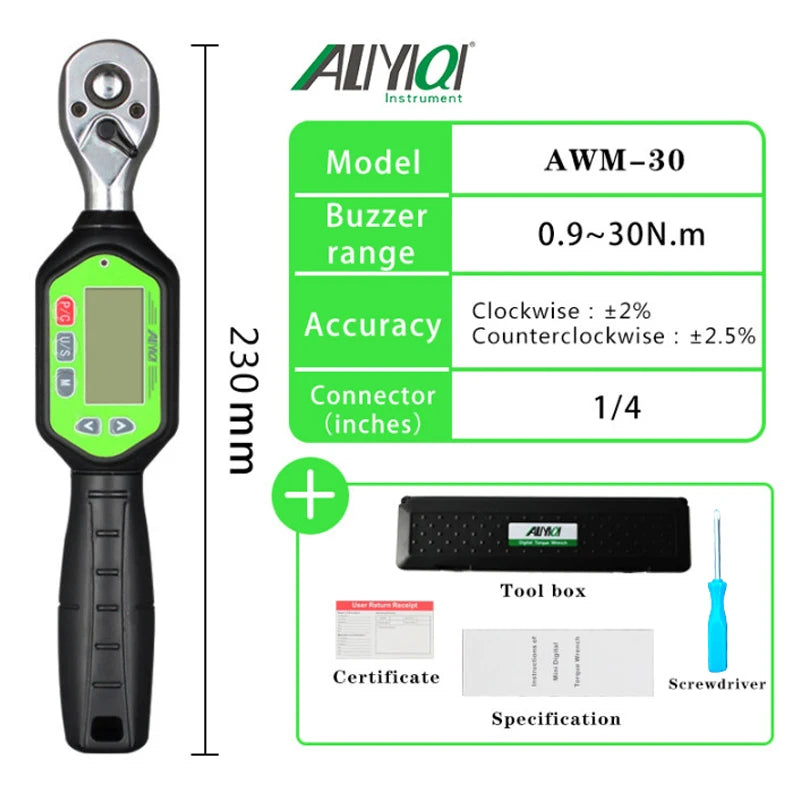 The mini digital wrench is designed in a miniaturized shape and is more suitable for the operation in a narrow space. Meanwhile, it has complete operating functions including torque setting function, unit setting function, numerical value storage function, numerical value eliminating function, numerical value output function and user correction function. It is easy to operate. The mini digital torque wrench is provided with the digital display screen, so that the requirement on operators is reduced. The mini digital torque wrench is suitable for fastening and controlling bolts in automobile industry, machinery industry, etc.